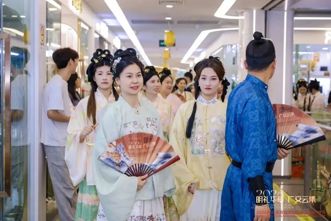 巡游队伍从一期外广场出发,穿过仿明“宾至门”,沿商场主通道缓步前行。锦衣卫方阵手持绣春刀(道具),气宇轩昂;才子佳人手持团扇、折扇,风度翩翩;仕女队伍步履轻盈,衣袂飘飘。
