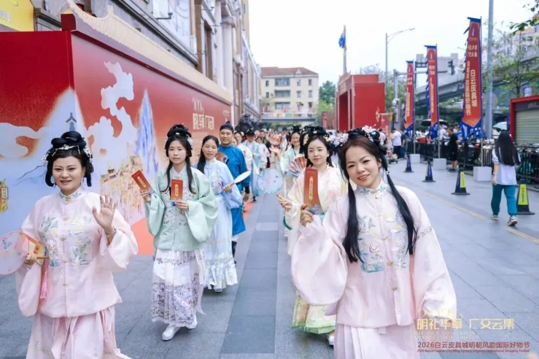巡游过程中,演员们不时与客商互动行礼、派发小礼品,引得采购商纷纷举起手机拍照、合影,社交媒体瞬间刷屏。