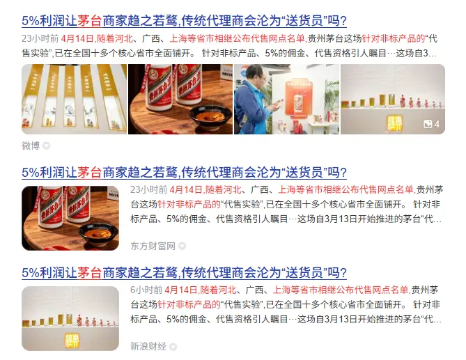 4月14日,随着河北、广西、上海等省市相继公布代售网点名单,茅台针对非标产品的"代售实验",已在全国十多个核心省市全面铺开,已布局约500家网点。代售模式下,非标茅台的经销商角色发生根本转变——从过去坐拥上千元价差空间的代理商,变身为赚取5%佣金的服务商。
