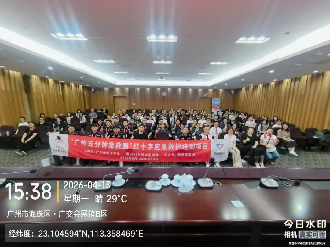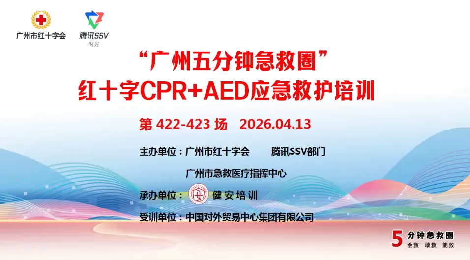 广交会作为外贸“第一展”,会场人流密集、活动密集,安全保障容不得半点松懈。为全面提升会场服务团队的应急处置能力,3月31日、4月13日,由广州市红十字会、腾讯 SSV 部门、广州市急救医疗指挥中心联合主办的 “广州五分钟急救圈” 项目,走进中国对外贸易中心集团有限公司,分 4 期开展 4 学时 CPR+AED 专项急救培训。本次培训通过系统化教学,让每一位会场服务人员都掌握硬核救命本领,为展会安全筑起坚实防线。