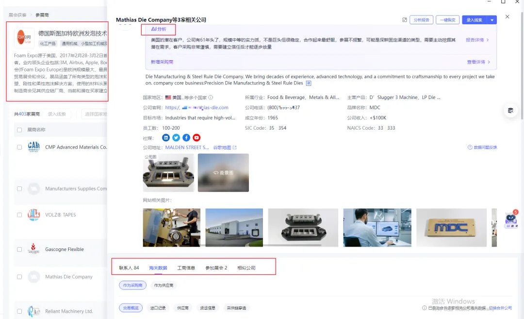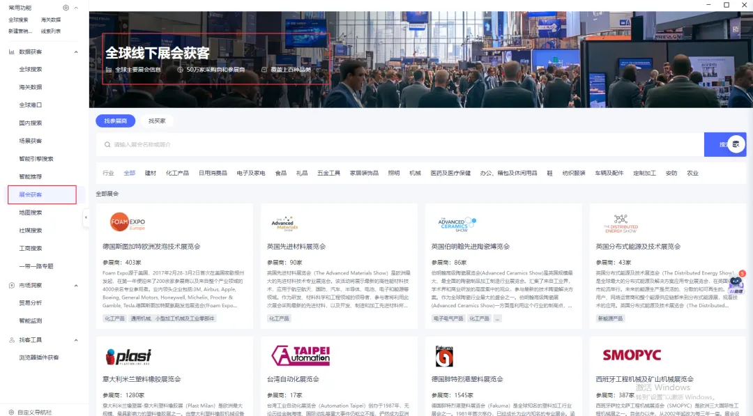 通过切换行业分类,寻找所在领域的线下参展商或采购商。也可以直接输入感兴趣的展会和买家名称搜索。任意选择一家展会,就能查看其参展商——这些参展商通常是较高需求的买家,还支持一键AI分析快速识别。