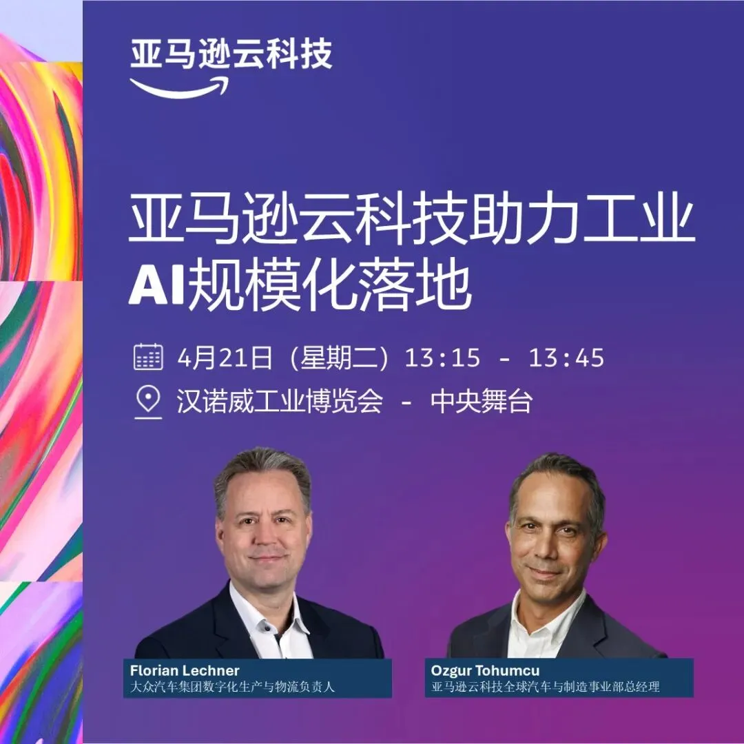 4月21日(周二)13:15-13:45,亚马逊云科技全球汽车与制造事业部总经理Ozgur Tohumcu将与大众汽车集团数字化生产与物流负责人Florian Lechner共同登台,分享《亚马逊云科技助力工业AI规模化落地》,了解大众如何将亚马逊云科技驱动的数字生产平台扩展到全球40多个工厂。