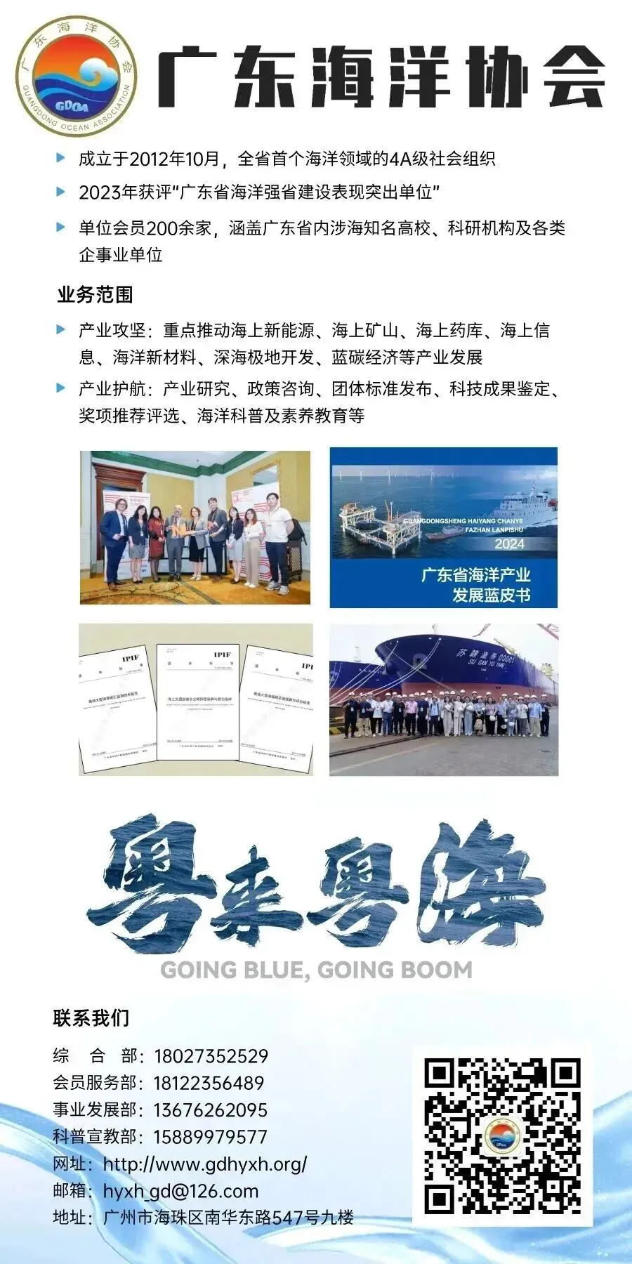 关于组团参加2026中国海洋经济博览会的通知关于组团参加2026中国海洋经济博览会的通知 各会员单位: 为进一步促进全球海洋经济发展与合作,据悉,2026中国海洋经济博览会将于2026年10月22日-24日在深圳国际会展中心(宝安新馆)举行。广东海洋协会将继续组织会员单位联合参展,现诚邀会员单位报名参加协会联合展团,共同把握“十五五”海洋发展新机遇。根据以往参展经验,协会联合展团可争取设在中心巡馆路线上,将有效聚集领导和专业观众到场参观洽谈,增加企业曝光量。 2025年,协会联合七家会员单位组团集中亮相海博会,起到了良好宣传展示效应,协会在海博会系列荣誉评选中荣获“2025中国海博会卓越贡献奖”。 除联合参展外,会员单位如通过协会申请独立展位,也可享受专属优惠价格。请有意向参展的会员单位于2026年4月24日前联系协会工作人员报名,联系人:成老师 18664882310,曾老师 18122356489 广东海洋协会 2026年4月17日 精彩回顾