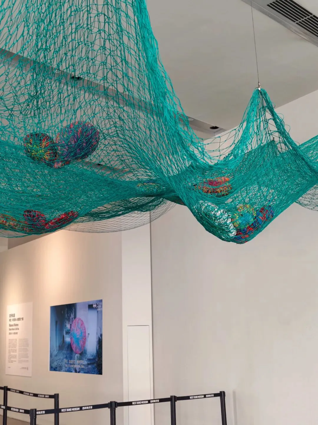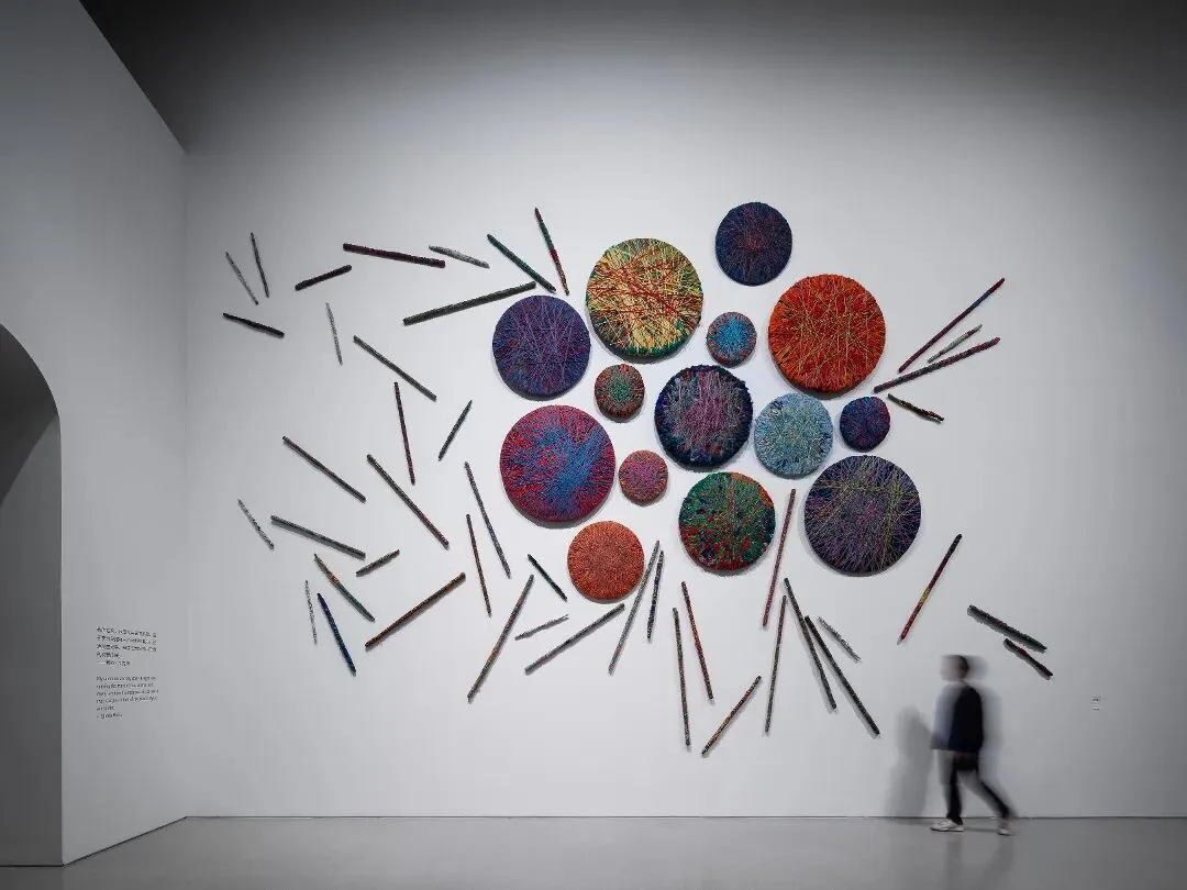 展览同时延伸至西岸美术馆一楼中庭与二楼公共空间,并免费向公众开放。展览不始于展厅,而始于进入空间的瞬间,公众步入美术馆时,就已经置身一种全新的感知现场。施慧的大型装置《归一》自中庭高处垂落,观众可以穿行其间,在行走中感受材料与身体之间的关系;《老墙》则由纸浆砖块层层砌筑而成,长达八米,其灵感源于艺术家对杭州吴山山墙变化的观察与记忆;希克斯的《流吧,河流》、《靶》以丰富的色彩与柔性材料介入建筑空间,使作品与美术馆建筑真正发生对话,宣言着希克斯“柔性建筑”理念的在地延展。围绕其间呈现的文献与档案,也构成另一层阅读的路径。在日常的行走与停留之间,观众对“物”的再度感知逐渐被激活。