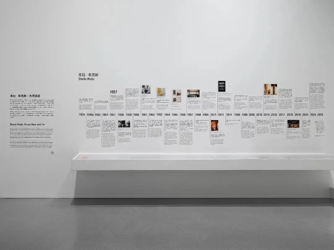 希拉·希克斯(Sheila Hicks),1934年出生于美国,现居巴黎。作为当代艺术的先驱,她通过七十余年的实践不断拓宽艺术边界。她曾师从包豪斯大师约瑟夫·阿尔伯斯(Josef Albers),并深受南美古代纺织文化启发,创造出融合现代主义与前哥伦布文明传统的视觉语言,其作品被纽约现代艺术博物馆及蓬皮杜中心等机构收藏。希克斯将纤维视为“字母表”,她的创作从微型编织(Minimes)到宏大空间装置,跨越各种尺度。希克斯不仅仅关注材料感知力,更致力于和全球建筑及设计领域建立跨界合作,赋予纤维新的可塑性,并将其转化为富有韵律感的空间结构。她的作品如同一部“编织日记”,以不同的物及多样的色彩,将时间、心境、个人游历编织为可触知的纹理,邀请观众在感官思考与理智感受间达成深度共鸣。