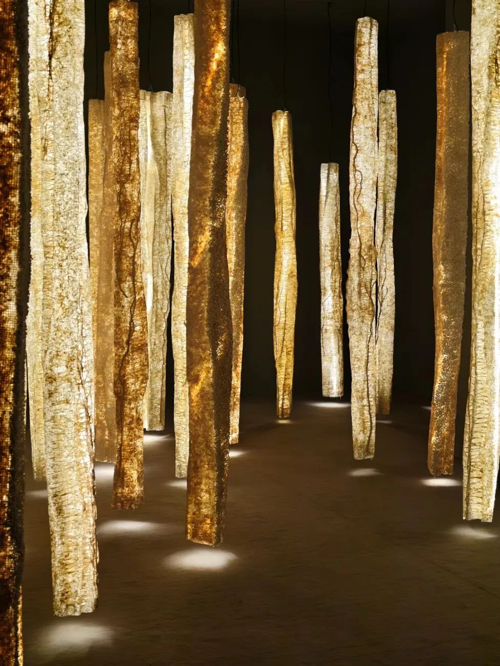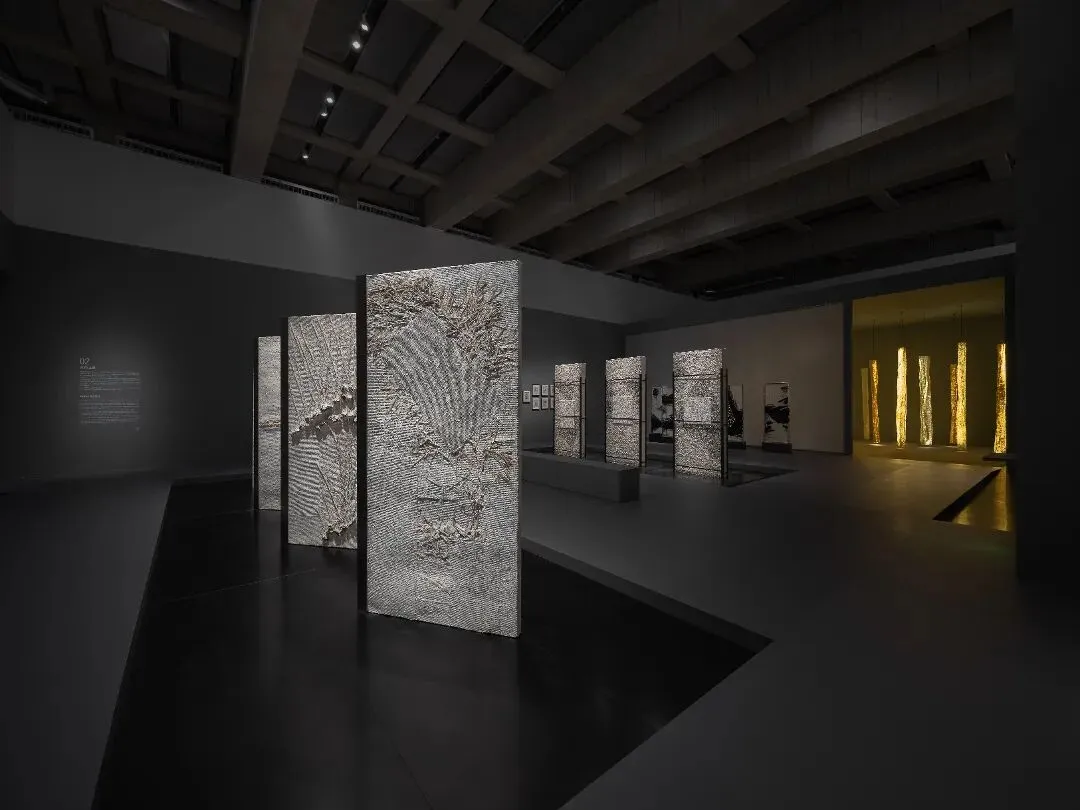 展厅里运用错落式展台,构建出游览山河湖海般的视觉层次,山川、河流、星空与海洋被赋予新的形态,使公众宛如置身于一片由纤维构成的地理景观之中。
