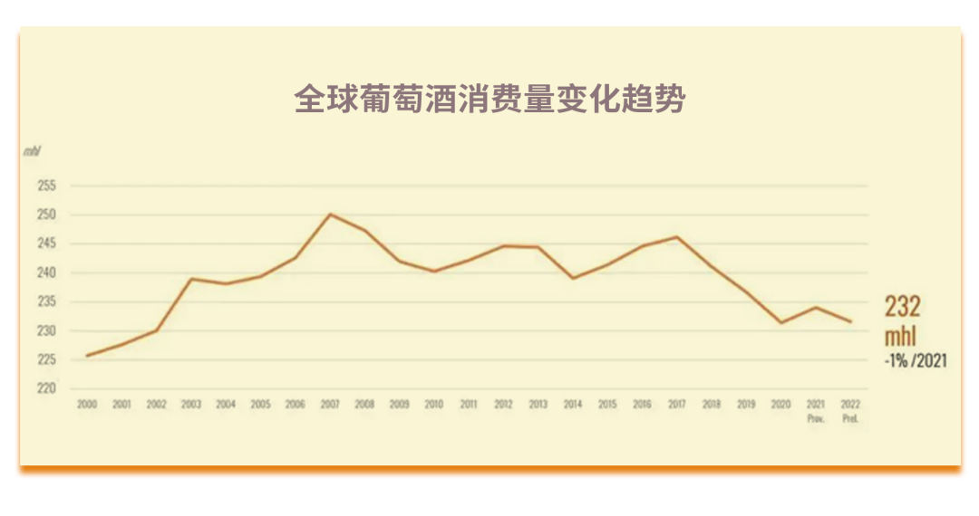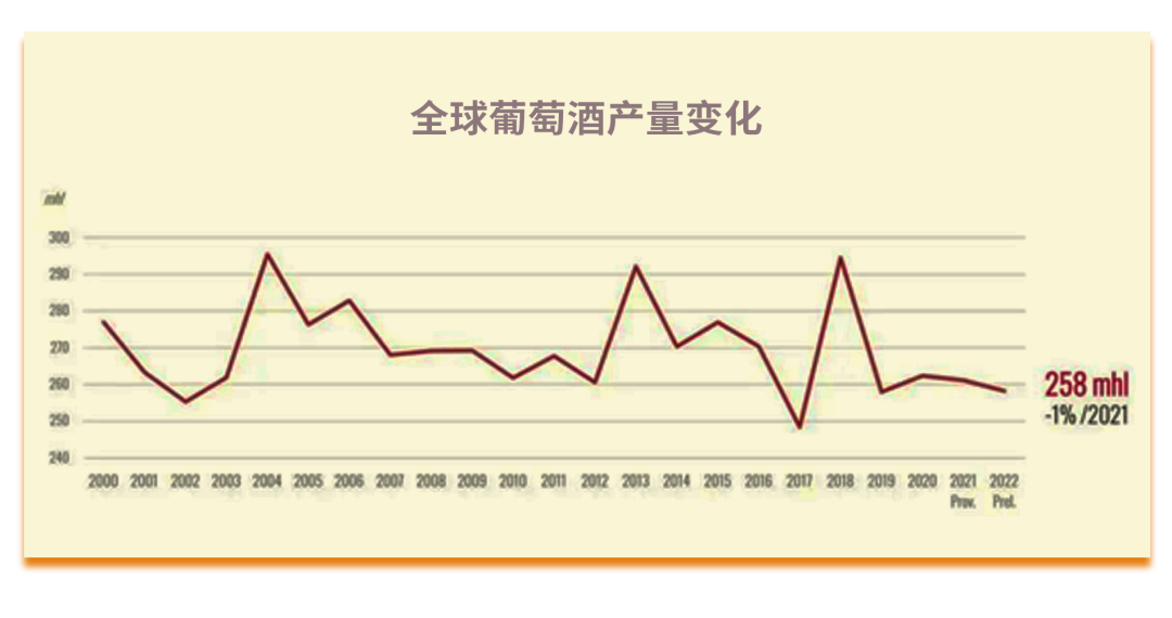 2022年,全球葡萄酒产量258亿升,较2021年下降了1%。总的来看,从2018年起,全球葡萄酒产量已连续四年稳定在260亿升左右。这一趋于稳定的产量数据,表明在全球葡萄酒市场已趋于饱和状态。
