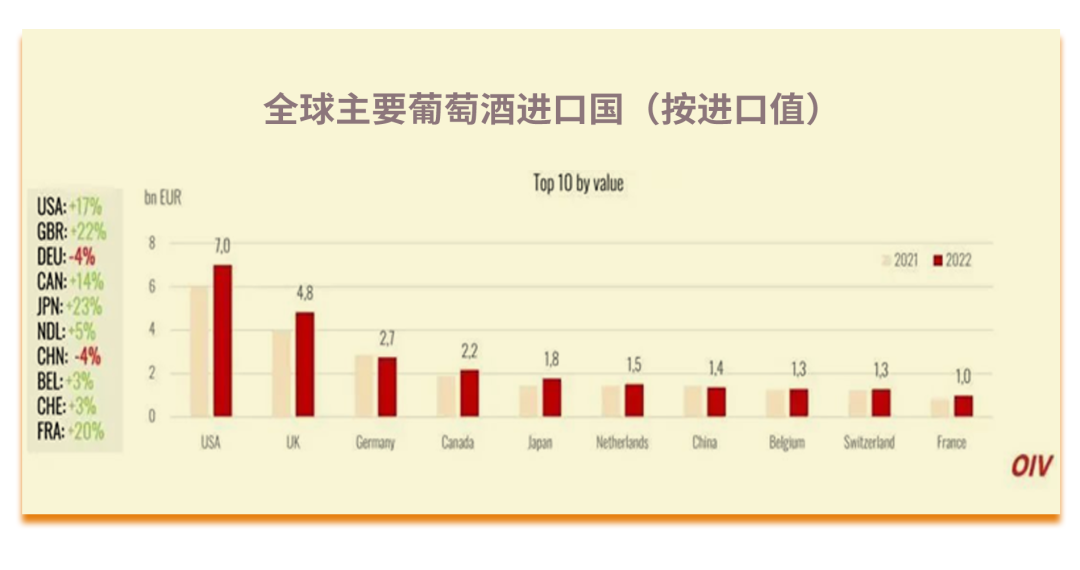 2022年,全球三大葡萄酒进口国美国、德国、英国,葡萄酒进口值分别增长17%、-4%、22.1%。