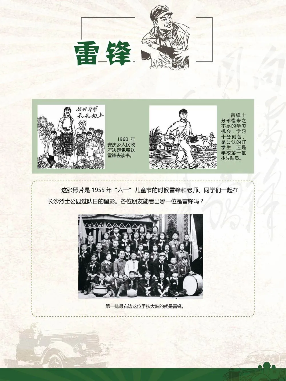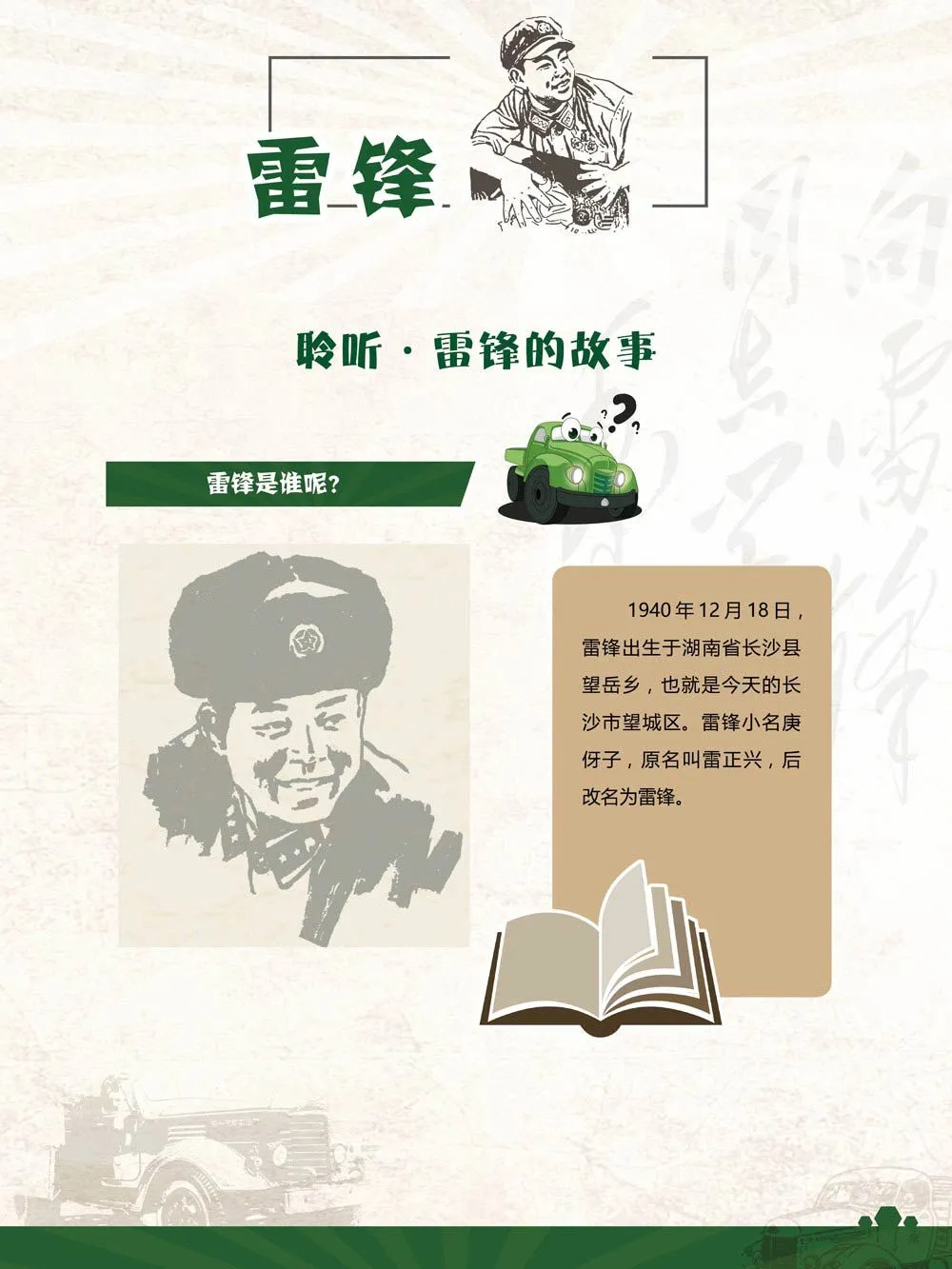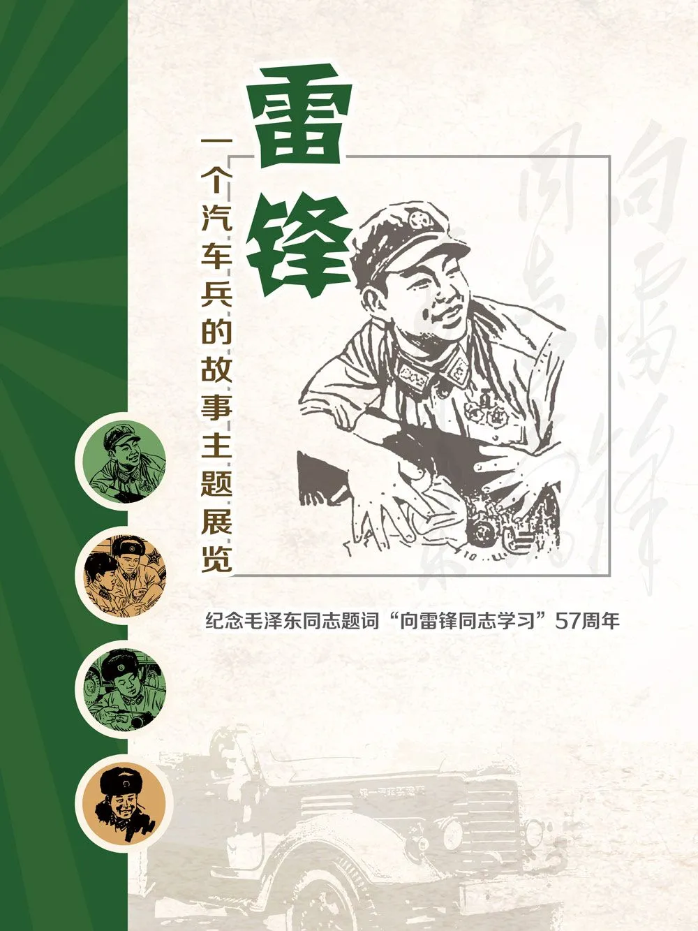 2020年,恰逢纪念毛泽东同志题写“向雷锋同志学习”57周年,值此契机,我们特别举办“雷锋,一个汽车兵的故事”线上主题展览。本展分为“聆听·雷锋的故事、讲述·雷锋与汽车、遇见·身边的雷锋”三部分,在新时代诠释雷锋精神的真正意义,广泛传播学雷锋先进典型,凝聚起建设社会主义核心价值体系的强大力量,踏着时代的旋律,与雷锋同行,与文明携手,为实现“中国梦”提供强大的精神动力。