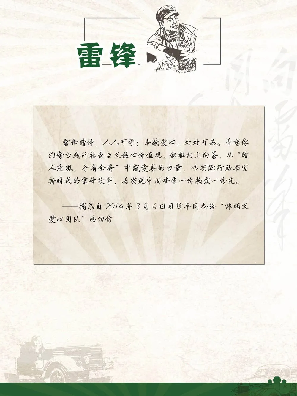 雷锋,一个朝气蓬勃的阳光青年以平凡演绎伟大,以短暂化为永恒,以有限换来无限,展现出社会主义核心价值体系鲜活的精神力量和人格魅力;雷锋,一名新中国的普通战士,共和国的开国领袖们纷纷为他书写下振聋发聩、响彻云霄、传遍五洲的号召;“向雷锋同志学习!”一句响亮的口号,激励着一个民族,鼓舞着一代又一代后来者,接过雷锋的火炬,成长为新时代的雷锋!