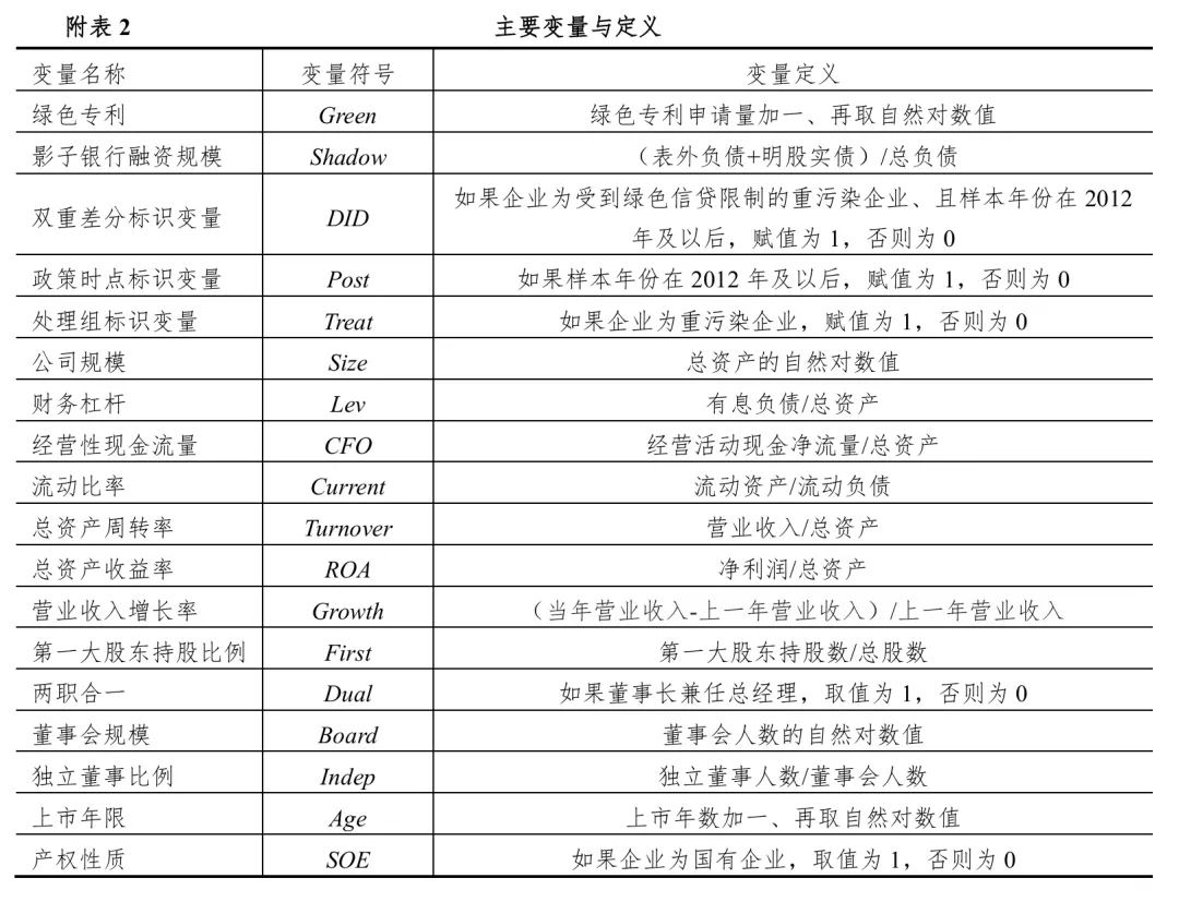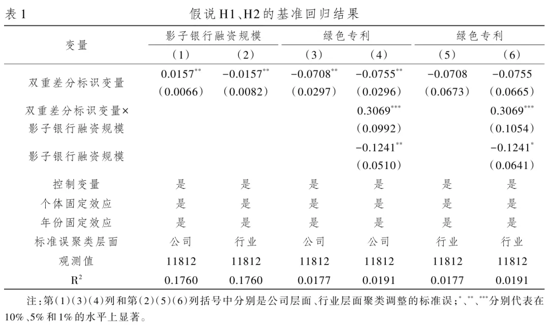 模型(1)被解释变量为影子银行融资规模(Shadow),采用 “(表外负债 + 明股实债)/ 总负债” 衡量,该指标借鉴表外负债与明股实债资金主要来源于影子银行的思路测算,并通过地区影子银行水平相关性检验、《资管新规》冲击双重差分检验验证了合理性;核心解释变量 DID 为重污染企业虚拟变量(Treat)与政策实施时间虚拟变量(Post)的交互项,同时控制公司与年份固定效应。模型(2)被解释变量为绿色专利(Green),以绿色专利申请量加 1 取自然对数衡量,用于反映企业绿色创新活跃度,通过 DID 与 Shadow 的交互项检验影子银行融资的调节作用,以验证其对绿色信贷政策倒逼效应的影响。
