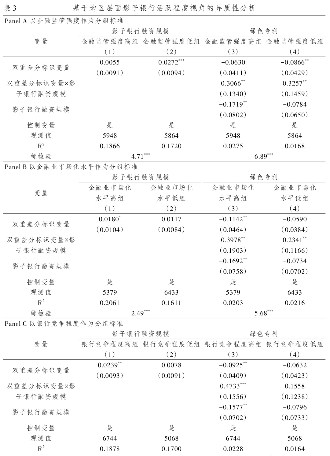 前文已证实影子银行能够缓解绿色信贷下重污染企业的融资约束,但其作用效果受地区影子银行活跃度影响,存在明显区域差异。为此,本文从金融监管强度、金融业市场化水平、银行竞争程度三个维度刻画地区影子银行活跃度,并开展分组异质性检验。第一,以区域金融监管支出 / 金融业增加值衡量金融监管强度,按 2011 年省份均值分为高、低组;第二,采用樊纲指数中的金融业市场化水平,同样以 2011 年省份均值分组;第三,使用1−银行业赫芬达尔指数衡量银行竞争程度,依据 2011 年省份均值划分为高、低组。表 3 的 Panel A、B、C 分别报告了三组回归结果,其中第 (1)–(2) 列为影子银行融资规模的分组回归,第 (3)–(4) 列为绿色专利的分组回归,结果均表明在金融监管较弱、金融业市场化水平更高、银行竞争更充分的地区,影子银行对绿色创新的正向调节作用更强,与本文理论预期完全一致。