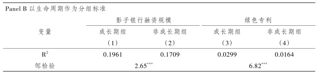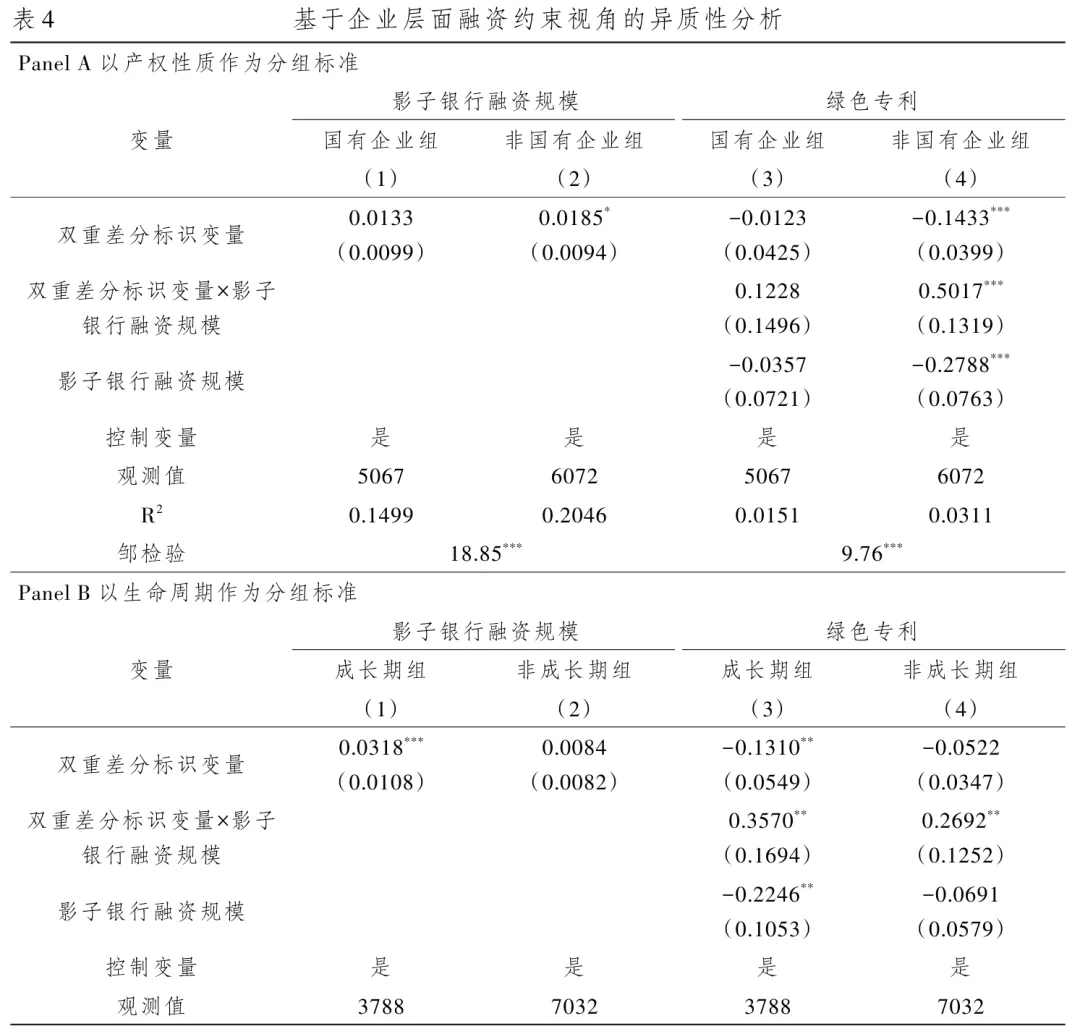 重污染企业转向影子银行融资的核心原因是绿色信贷带来的融资约束与资金缺口,融资压力越大,影子银行的调节作用越明显。为此本文从产权性质和企业生命周期两个维度进行分组异质性检验:一是按国企与非国企分组,非国有企业融资约束更强、融资惩罚效应更显著;二是依据成长型与非成长型分组,成长期企业资金需求更高、融资难度更大。表 4 Panel A、B 分别展示两组回归结果,其中第 (1)–(2) 列为影子银行融资规模回归列,第 (3)–(4) 列为绿色创新回归列,结果显示影子银行对绿色创新的倒逼作用在非国有企业与成长期企业中更强,全部回归结果均与理论预期一致。
