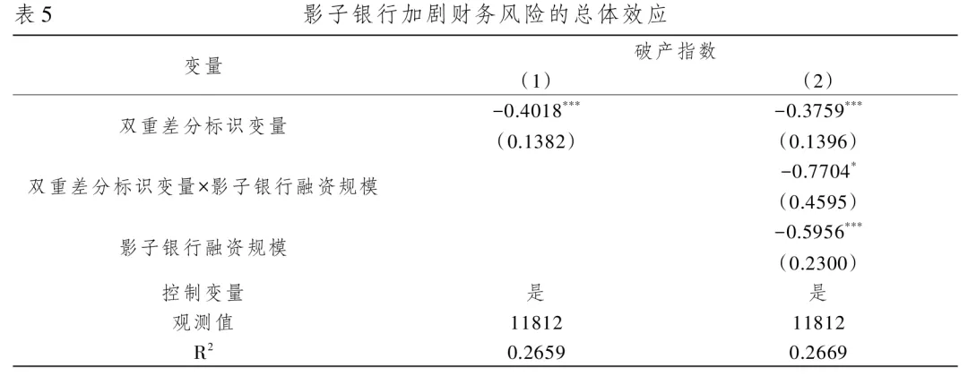 表 5 报告了以破产指数为被解释变量的回归结果。其中第(1)列结果显示,双重差分标识变量的回归系数在 1% 的水平上显著为负,说明绿色信贷政策带来的融资惩罚效应会直接导致重污染企业财务风险上升。第(2)列结果显示,影子银行融资规模的单变量系数在 1% 水平上显著为负,影子银行融资规模与双重差分标识变量的交互项系数在 10% 水平上显著为负,表明影子银行融资规模的提高不仅会直接加剧企业财务风险,还会间接强化绿色信贷政策对财务风险的抬升作用,为本文理论逻辑提供了经验支撑。