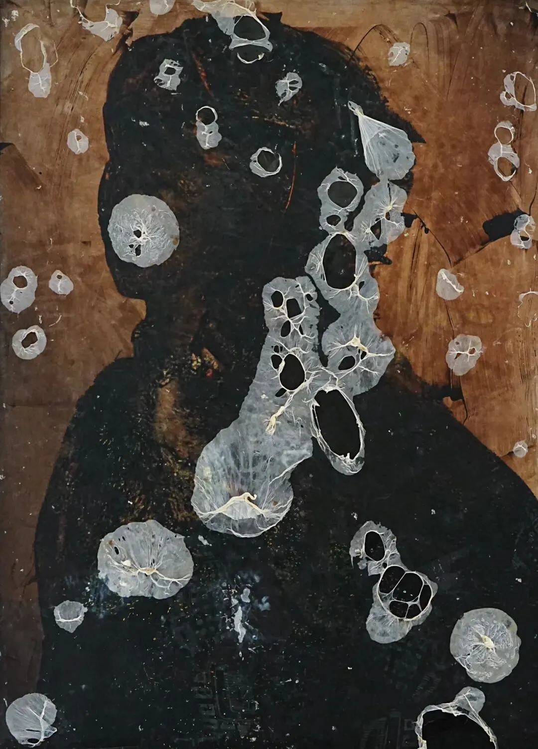 艺术家将AI生成的,代表至高“意识”的图像转印至易腐的物质表面,后用乳胶覆盖