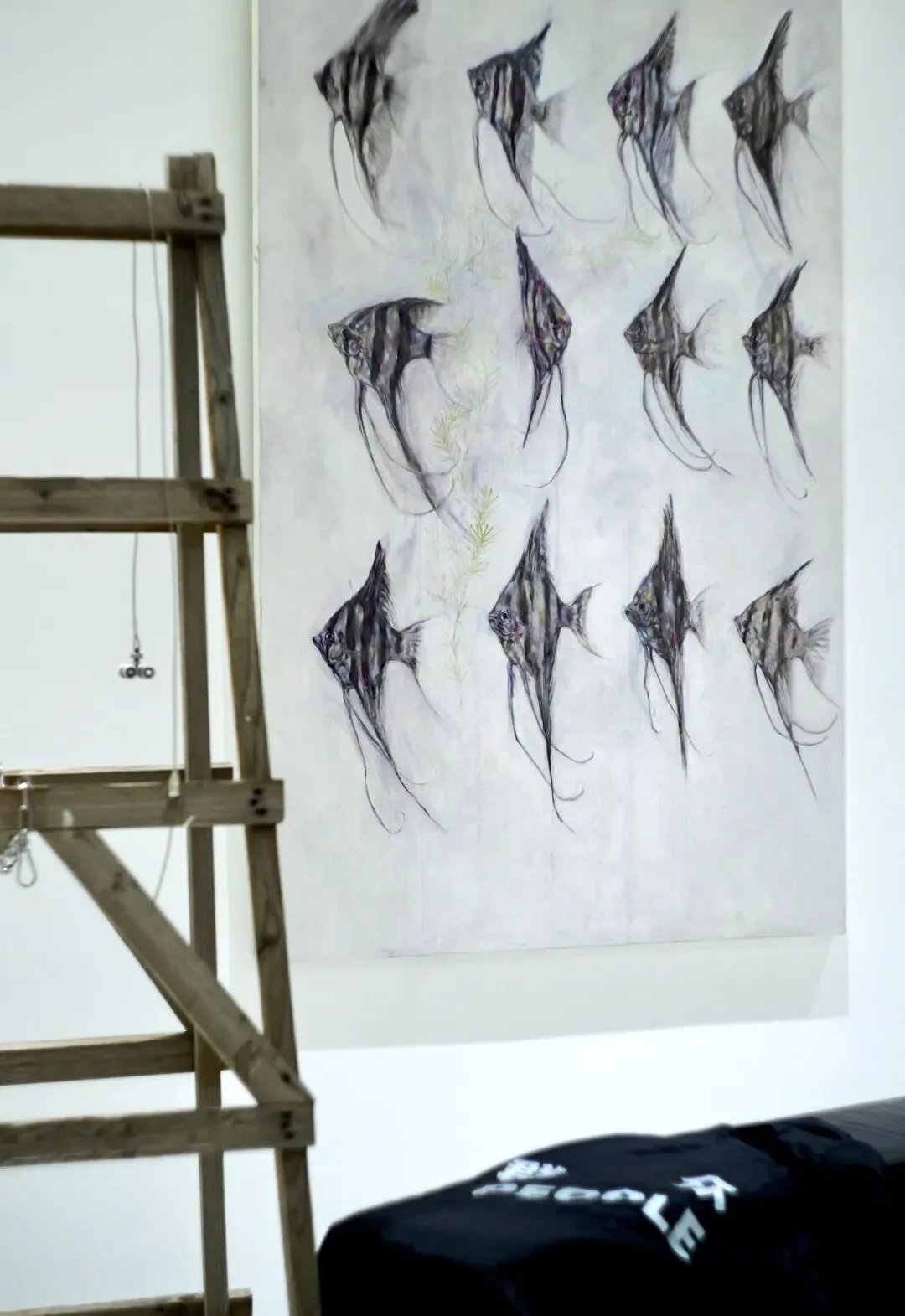 作品以神仙鱼为主要形象,其形态在画面中不断被描绘、变形与重组。