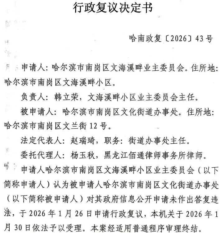 因文化街道办事处在与业主、业委会沟通中提出,小区业委会招投标活动应当由办事处批准方可进行,为确认此事,申请人(业委会)于2025年12月23日向被申请人邮寄提交了《政府信息公开申请表》,申请获取“由南岗区文化街道办事处批准业主委员会公开招投标的依据、程序、条件”。被申请人未依法答复后,申请人复议,案号哈南政复〔2026〕43号。