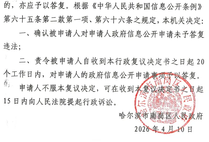 街道办批准小区招投标?南岗区政府:逾期不答复违法!哈南政复〔2026〕43号