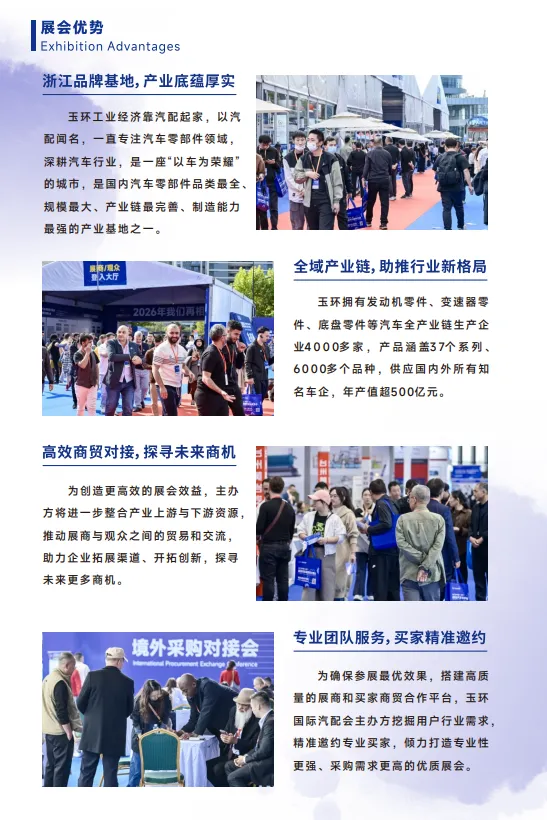 针对此次宣传推广活动,组委会精心制作了邀请函,详细介绍第三届中国(玉环)国际汽车零部件交易会的基本情况、展品范围、同期活动等内容,定向邀请高质量的专业买家和行业领军企业于2026年8月7日-9日奔赴玉环参展参观。