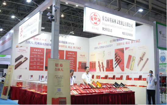 东莞市筷福林文化创意有限公司(以下简称“筷福林”)位于国际时尚家居用品展区。该公司主打筷子文创礼品的设计及生产,致力于将中国传统文化融入筷子的设计里,进而达到把餐具赋予传统文化附加值,同时也通过礼品化表达出人与人之间的美好祝愿。