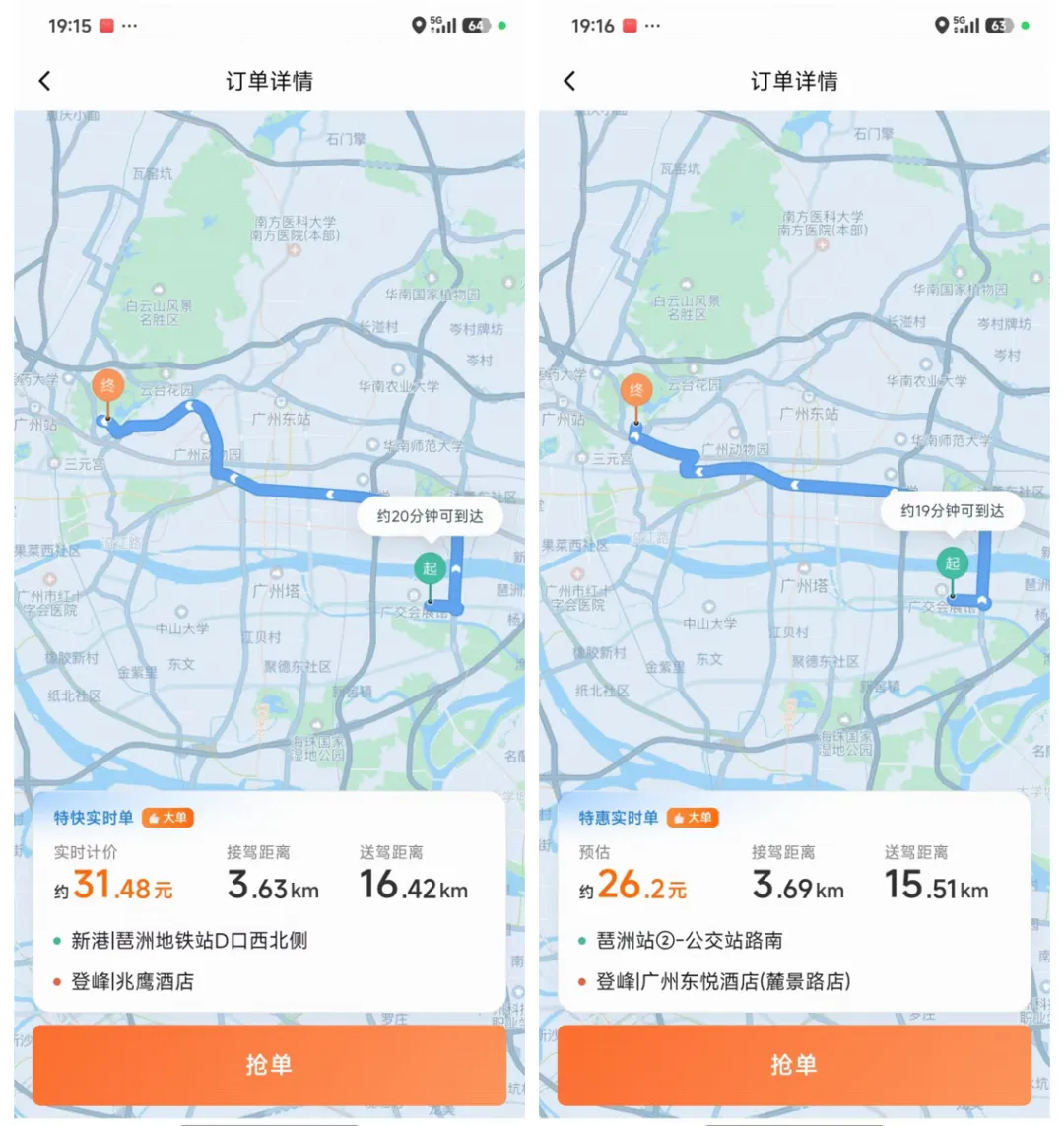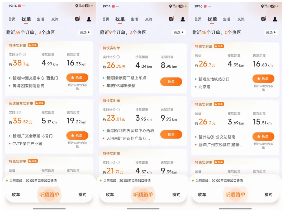 ),如此要求加福利,试问哪位的士大佬不去“打个卡”?多不胜数的巡游的士纷纷往“刷任务拿巨额奖励”,尤其是那阅江中路,能够不堵?万一碰上因巨量巡游的士排队而实施交通管控,咱网约车前往接乘客的那最后一公里,绝壁会把司机师傅们逼疯!没补贴,补贴少就算了,相比广州的巡游的士,网约车的运价简直可称之为“白菜”,仅仅一两公里的进出行程,前往接驾堵个十多二十分钟,出来再堵十多二十分钟,以广州当前晚高峰的(快车)时长费0.27元/分钟为例,这半小时甚至更长时间的一公里路程,时长计价(减除起步)撑死了不过3、4元——相比巡游的士,这么一堵至少是10元以上啊!连特快甚至甄选快车都没人接,真搞不懂怎么还有人敢下特惠、随心接的单子了……接乘客的时间10多20分钟起步,看价格是有点美丽,可连接带送一小时就30多,何苦要钻进去受那个罪?!3、不是没有网约司机“冒死”冲进去,风浪越大鱼越贵在一年又一年的强化教育下,前来参加广交会这些外国友人也开始“精明”起来——大家都懂巡游的士贵且坑(只非常小的一部分会坑人,其他都挺老实的),打网约车才是真正的“多快好省”……可年复一年、日复一日的“省”,到今天却是“一车难求”了……根据几个“胆子”比较大的伙伴反馈,广交会周边道路可是“遍地乘客”的盛况——是真的遍地!逛会场已经走了一整天,打个车等个把两小时打不到,甚至走出几公里情况依旧,这些外国友人们已经累得不行,直接摆烂坐路边去了!一旦有个车子停靠路边,不用等司机招呼,就马上会跳出几拨友人,操起不太熟练的中文,“求着”司机们接驾(悲哀