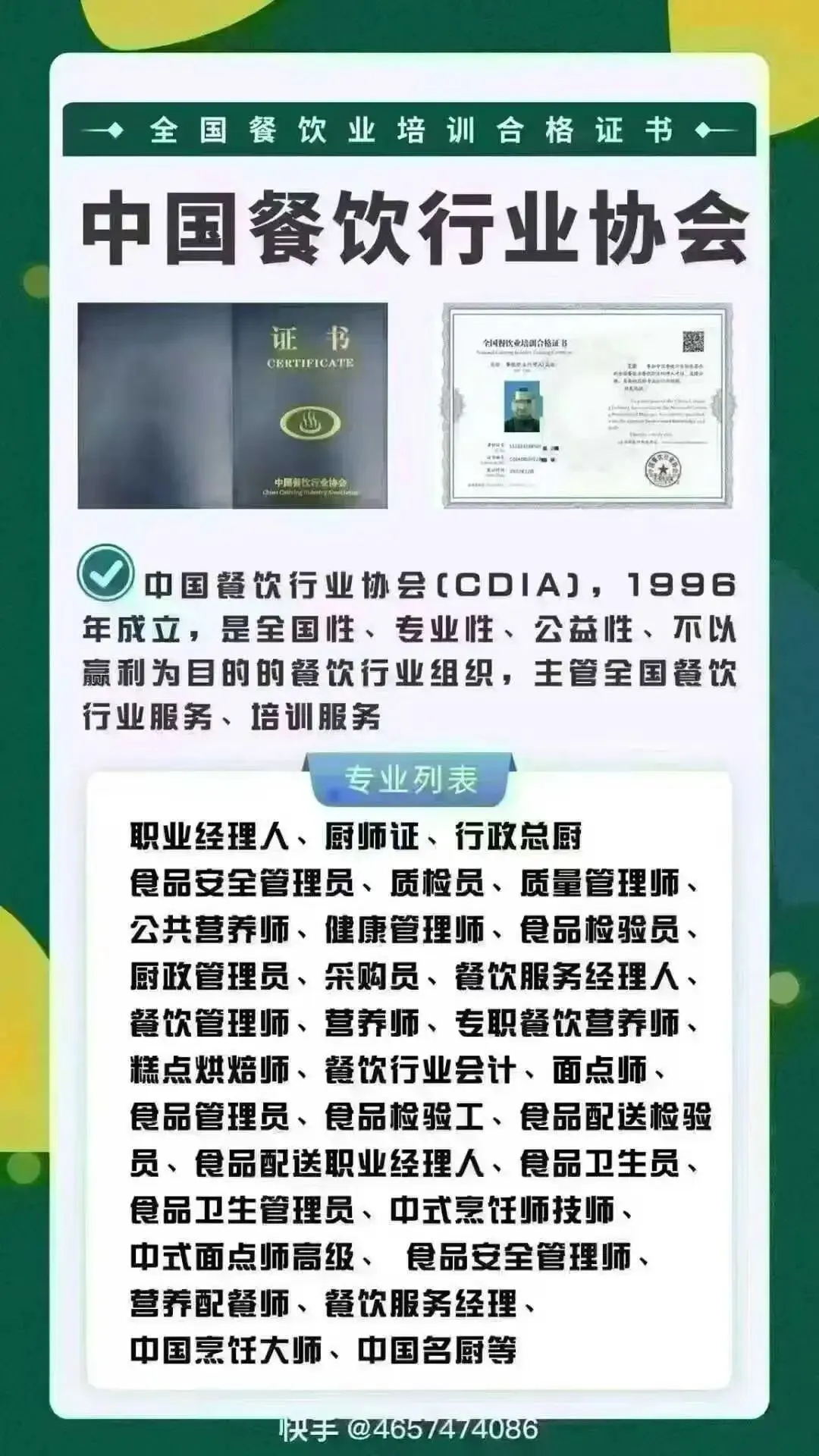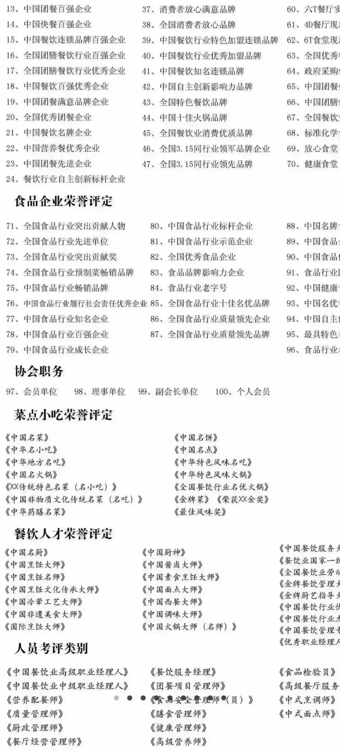 高级/中级职业经理人、厨师证、食品安全管理员、质检员、质量管理师、公共营养师、健康管理师、食品检验员、厨政管理员、采购员、餐饮服务经理人、餐饮管理师、营养师、专职餐饮营养师、糕点烘焙师、餐饮行业会计、面点师、农产品检验员、食品管理员、食品检验工、食品配送检验员、食品配送职业经理人、食品卫生员、食品卫生管理员、团餐烹饪管理师、中式烹饪师技师、中式面点师高级、食品安全管理师、国家一级评委、营养配餐师、餐饮服务经理、行政总厨、中国烹饪大师、中国名厨等