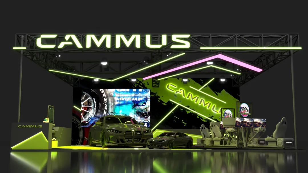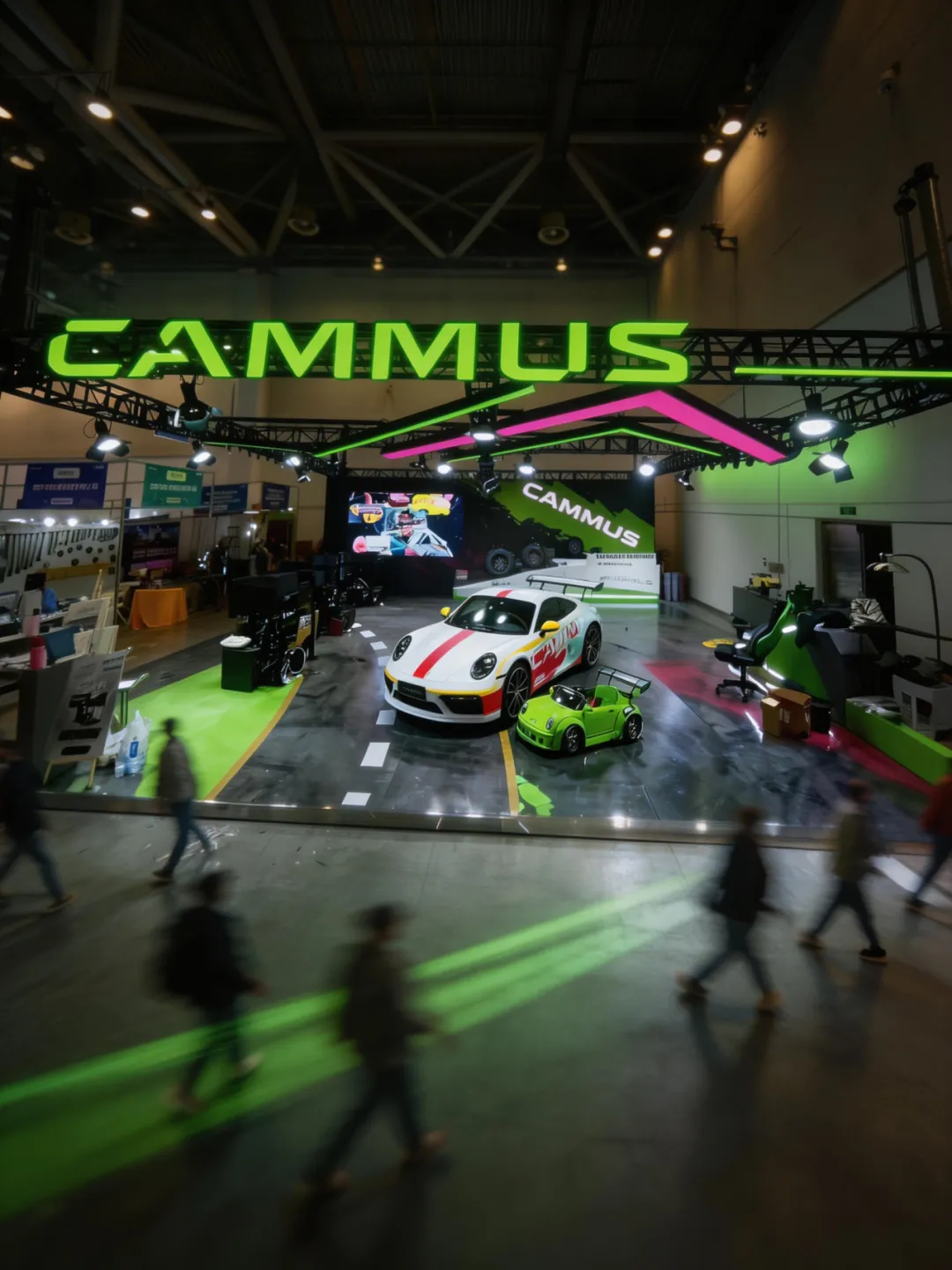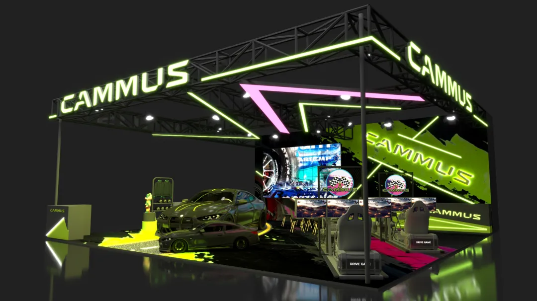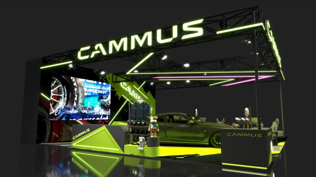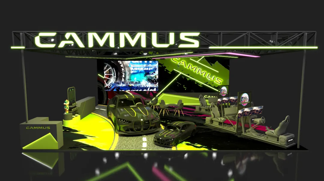 这个展台色彩醒目、大胆、极具品牌烙印。这种色彩的明暗对比(黑底 + 亮绿),让展车、模拟器等核心展品成为视觉焦点,突出了产品本身,避免了色彩喧宾夺主。