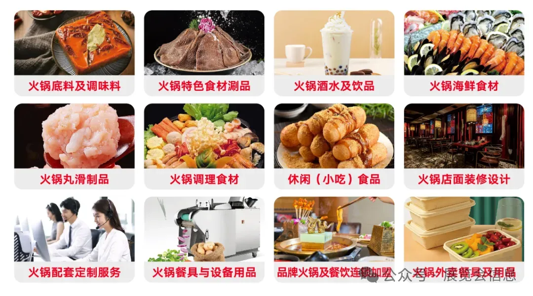 展品将更加全面的涵盖火锅全产业供应链各环节,包括火锅底料及调味料、火锅特色食材涮品、火锅酒水及饮品、火锅海鲜食材、火锅丸滑制品、火锅调理食材、休闲小吃食品、火锅店面装修设计、火锅配套定制服务、火锅餐具与设备饮品、品牌火锅及餐饮连锁加盟、火锅外卖餐具及饮品。倾力打造火锅行业供需双方一站式交易交流平台。