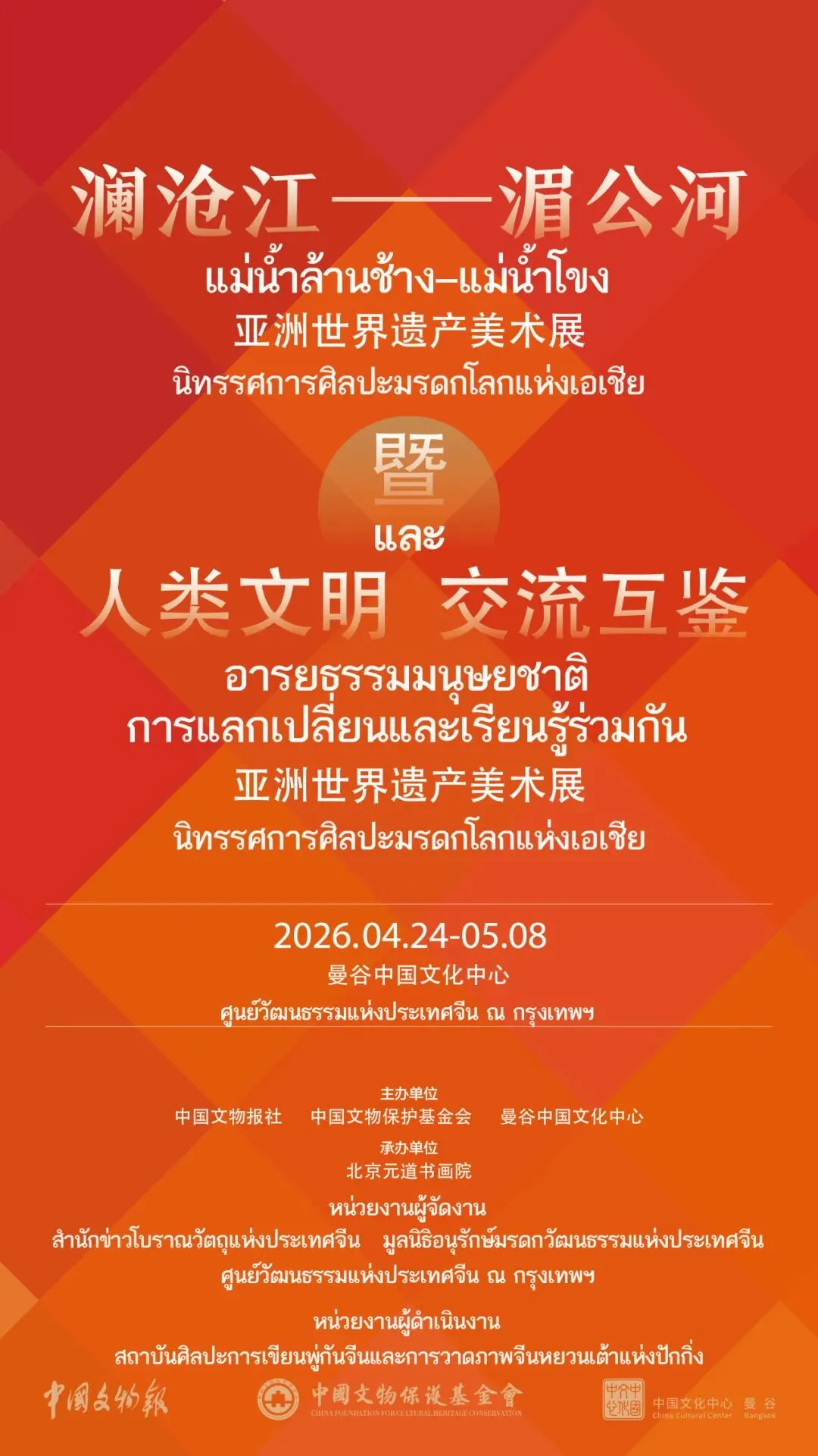 เพื่อเสริมสร้างความร่วมมือ การแลกเปลี่ยนทางวัฒนธรรมและการเรียนรู้ร่วมกันระหว่างประเทศในลุ่มแม่น้ำล้านช้าง-แม่น้ำโขง ในด้านการอนุรักษ์ วิจัยและสืบทอดมรดกโลก แม่น้ำล้านช้าง–แม่น้ำโขง: นิทรรศการศิลปะมรดกโลกแห่งเอเชีย” และ “อารยธรรมมนุษยชาติ: การแลกเปลี่ยนและการเรียนรู้ร่วมกัน นิทรรศการศิลปะมรดกโลกแห่งเอเชีย” ซึ่งจัดร่วมกันโดยสำนักข่าวโบราณวัตถุแห่งประเทศจีน มูลนิธิอนุรักษ์มรดกวัฒนธรรมแห่งประเทศจีนและศูนย์วัฒนธรรมแห่งประเทศจีน ณ กรุงเทพฯ กำลังจะจัดขึ้นที่ศูนย์วัฒนธรรมแห่งประเทศจีน ณ กรุงเทพฯ