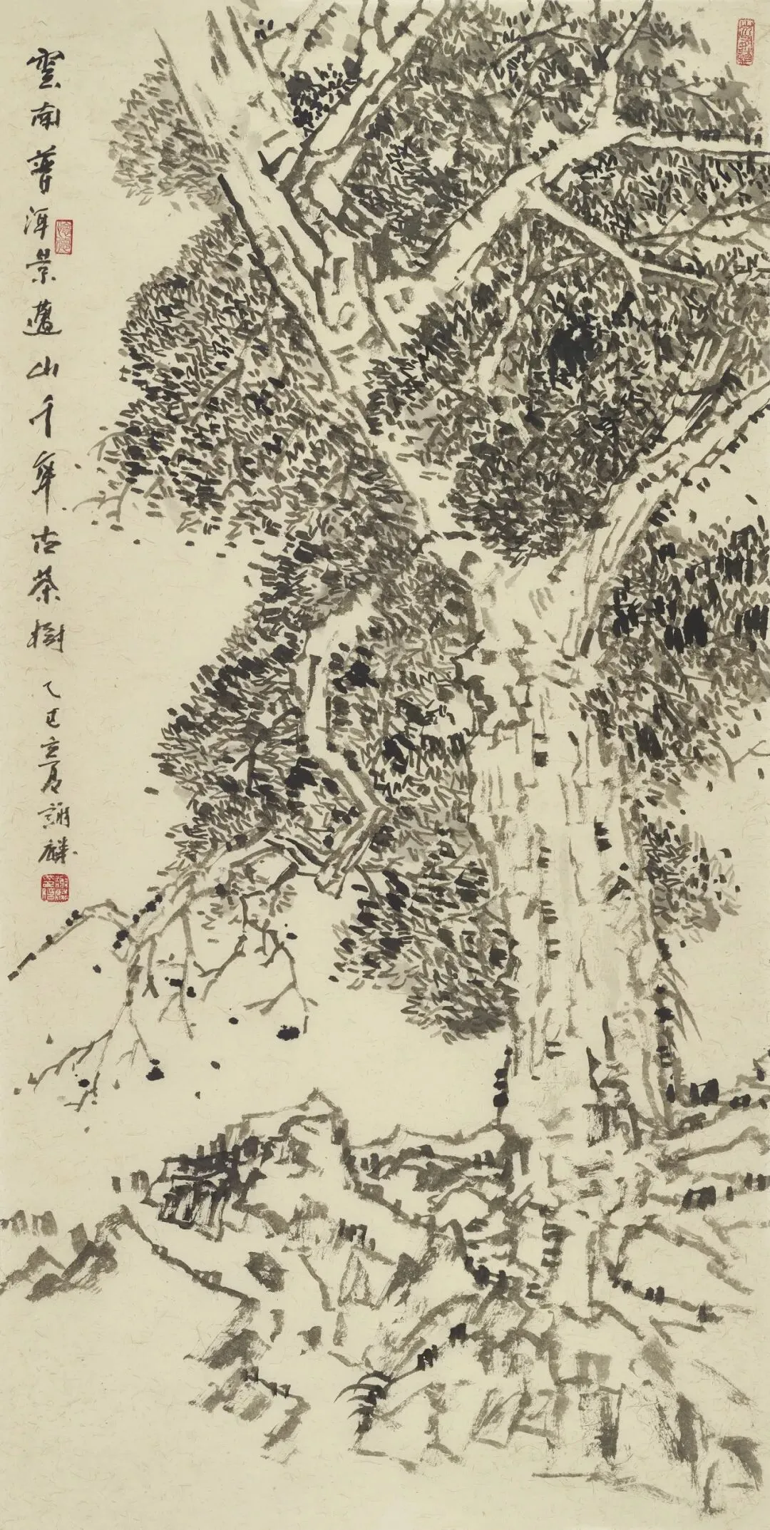 ผู้สร้างสรรค์ผลงาน: Xie Linชื่อผลงาน: ต้นชาพันปีแห่งภูเขาจิ่งม่าย เมืองผูเอ่อร์ มณฑลยูนนานวัสดุ: ภาพวาดหมึกจีน