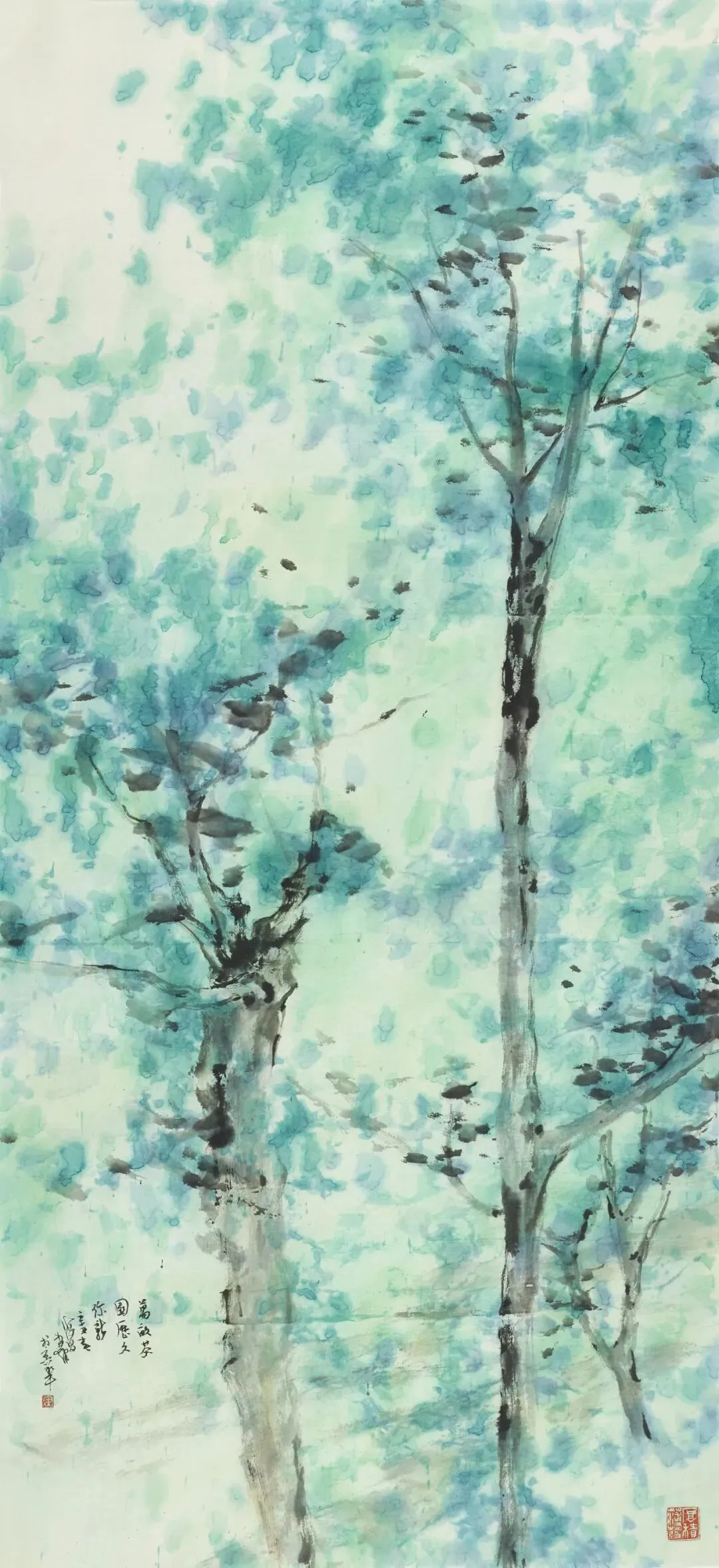ผู้สร้างสรรค์ผลงาน: Liu Haiyongชื่อผลงาน: ต้นไม้ที่แตกหน่อ — สิ่งที่ได้พบเห็นในอุทยานแห่งชาติฟ็องญา-แก๋บ่างวัสดุ: ภาพวาดหมึกจีนลงสี