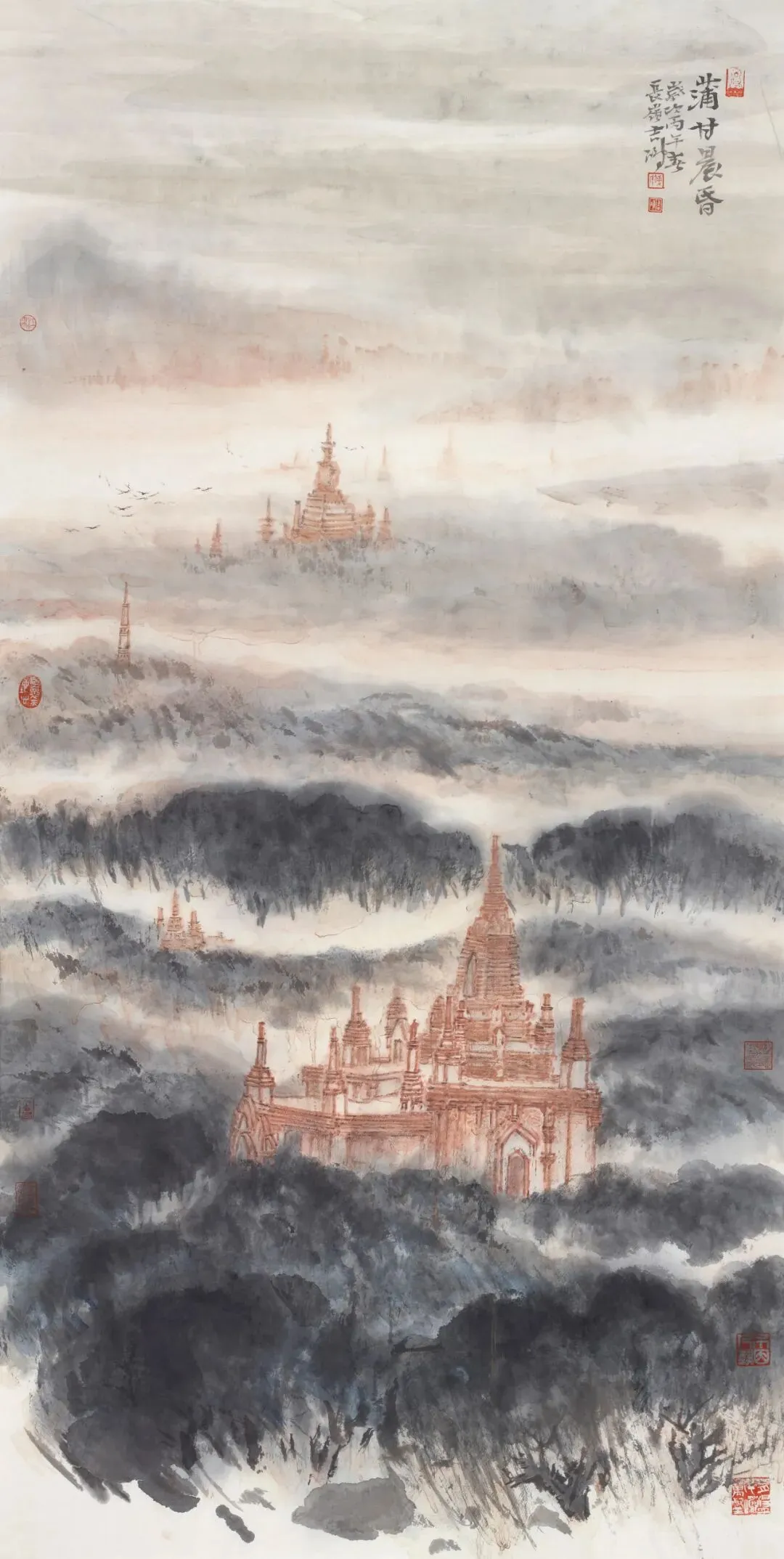 ผู้สร้างสรรค์ผลงาน: Fu Jihongชื่อผลงาน: พุกามยามรุ่งเช้าและพลบค่ำวัสดุ: ภาพวาดหมึกจีนลงสี