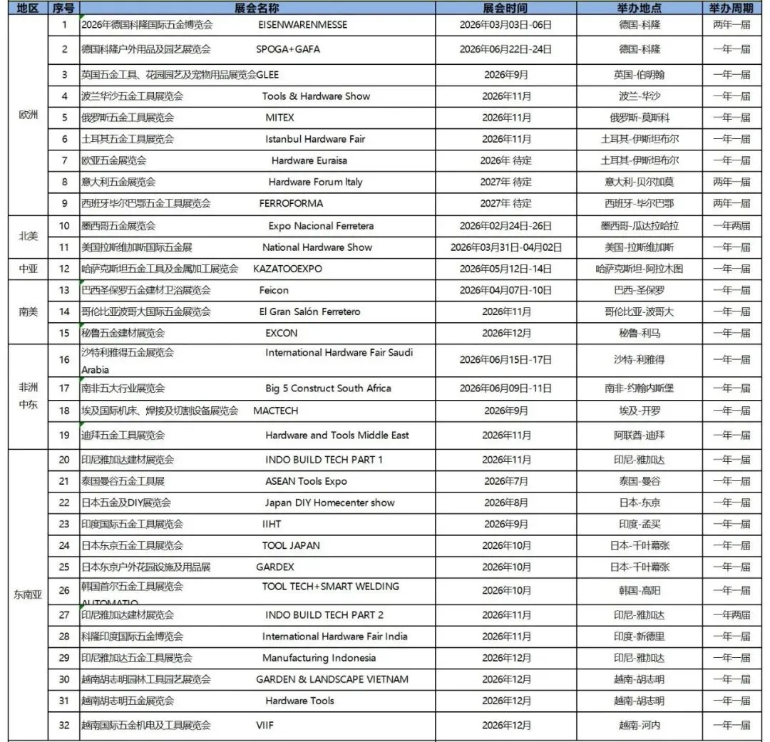 2026年全球五金工具展会计划表