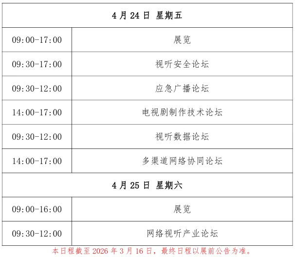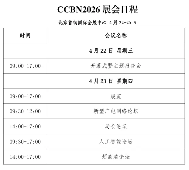第三十二届中国国际广播电视信息网络展览会(CCBN2026)将在北京举办,2026年4月22日(星期三)在北京首钢国际会展中心会议中心(1号馆二层)主报告厅举办开幕式暨主题报告会,4月23日(星期四)至4月25日(星期六)在北京首钢国际会展中心举办展览会、专题论坛等活动。