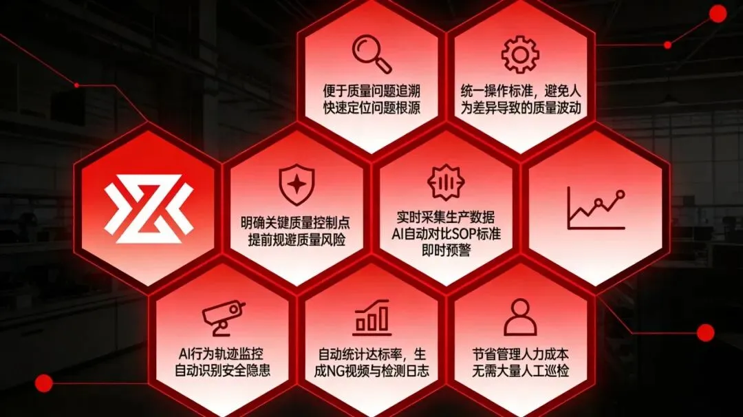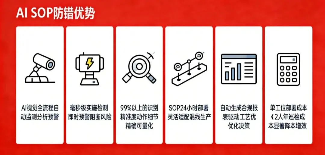很多企业对AI SOP防错系统认知模糊,用通俗的话讲,核心就是“用AI替人工,把标准盯到底”。区别于传统人工监督,它实现了从“事后追溯”到“事前预警”、从“主观判断”到“量化标准”的转型,让每一道工序都有“智能监督员”,让SOP真正落地生根。