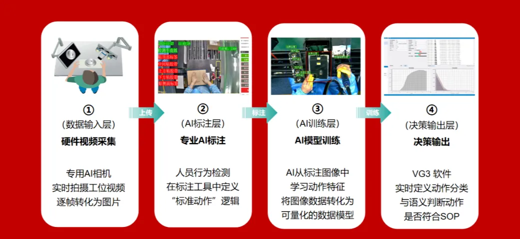 AI识别人员动作的本质,是通过硬件视频采集捕捉生产现场画面,再经AI标注、AI训练,将连续图像中的“人员肢体特征”转化为“可理解的动作语义”,最终完成决策输出,实现对操作动作的精准识别与实时监测。