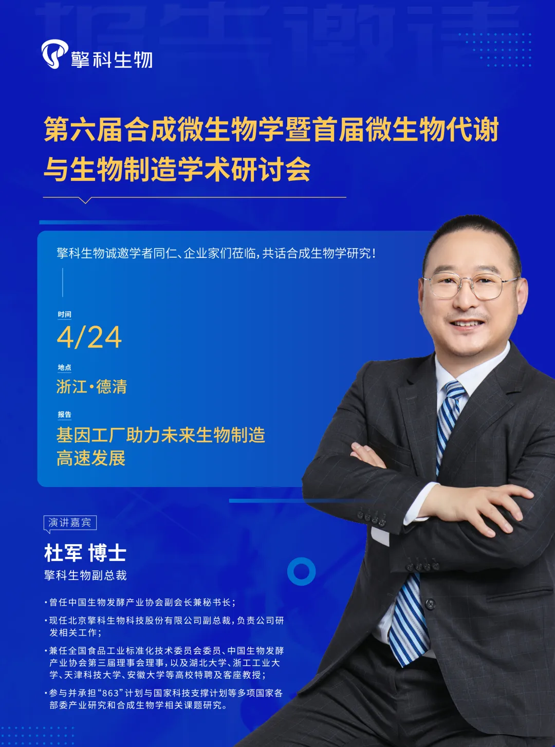 大会期间,擎科生物副总裁杜军先生受邀在4月24日“合成微生物驱动产业”论坛进行主题为《基因工厂助力未来生物制造高速发展》的主题报告,报告时间为11:30-11:55,地点位于开元名都度假酒店5号楼新市厅,期待您的莅临。