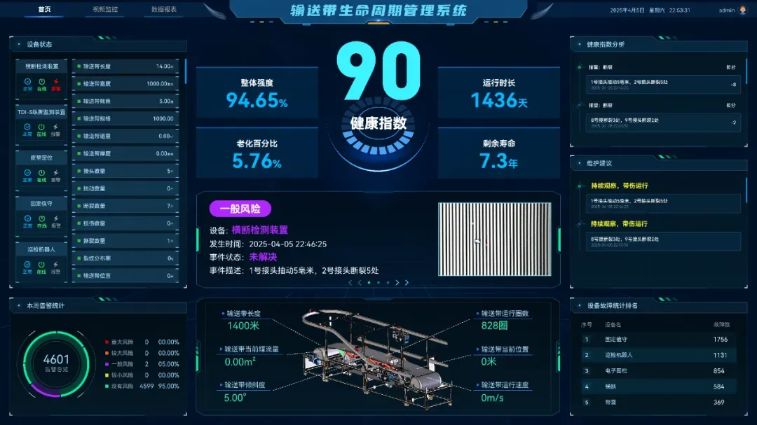 该设备基于AI人工智能技术,通过模拟人体“望、闻、听、切、思”,对输送机巷道进行自动巡检、数据采集与智能AI分析,将采集到的现场数据实时传送到地面集控室,整个皮带机巷道内的声音、温度、气体等状况形成实时数据,对井下环境、设施异常状况及设备运行故障实现了超前预判预警预防。