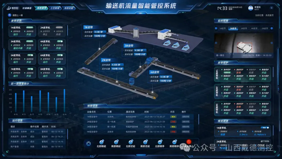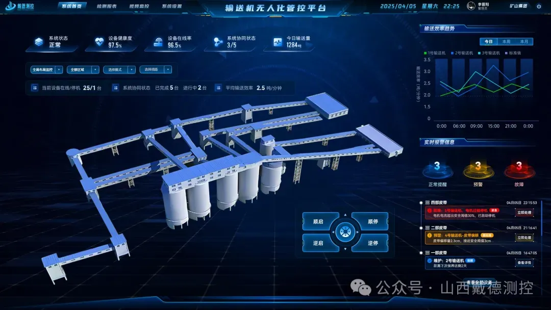 面向整条输送线路构建智能化集中管控体系,以设备安全运行为核心,整合全线路输送机、保护装置等设备的运行数据与安全状态,通过三维可视化监控、智能协同调度与全链路效能分析,实现主运输系统从单设备到全线路的安全可控、高效协同与管理精细化,保障运输环节的连续性与稳定性。