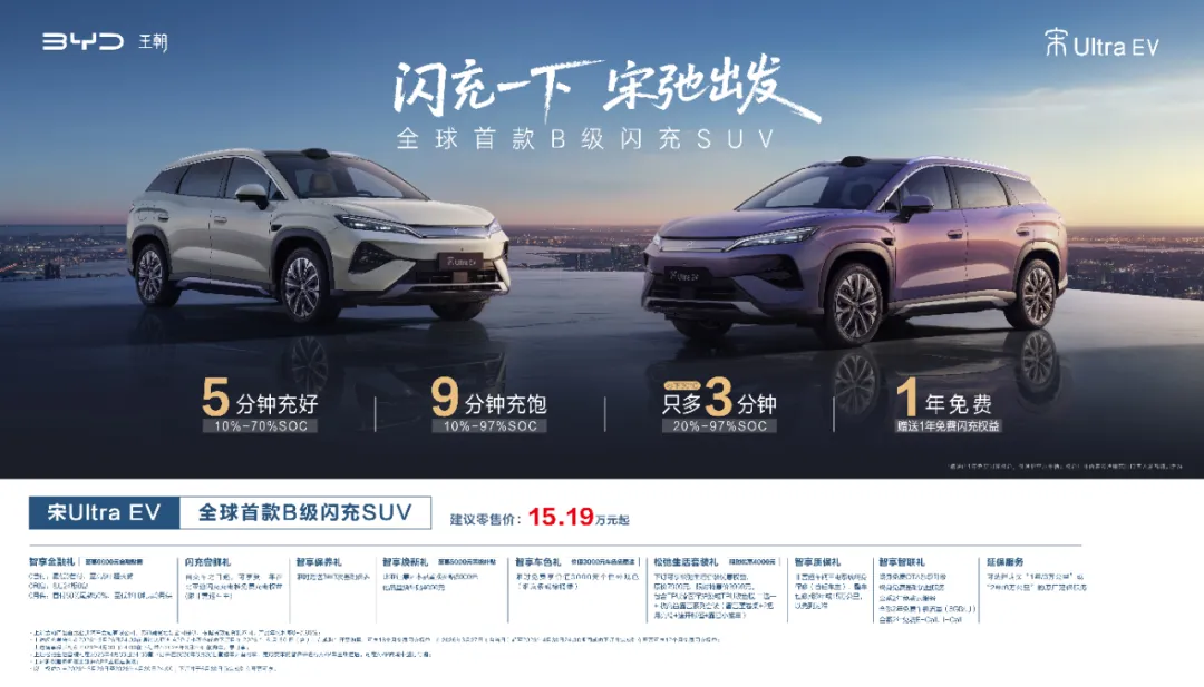 比亚迪王朝网宋Ultra EV15.19万起,作为一款面向主流家庭用户的B级纯电SUV,全系搭载第二代刀片电池及闪充技术,5分钟充到70%,9分钟充到97%,-30°C只多3分钟。现在订车还送1年免费闪充权益!比亚迪计划在2026年年底前建成约20000座闪充站,覆盖城市与高速出行场景,让你出行没有烦恼。
