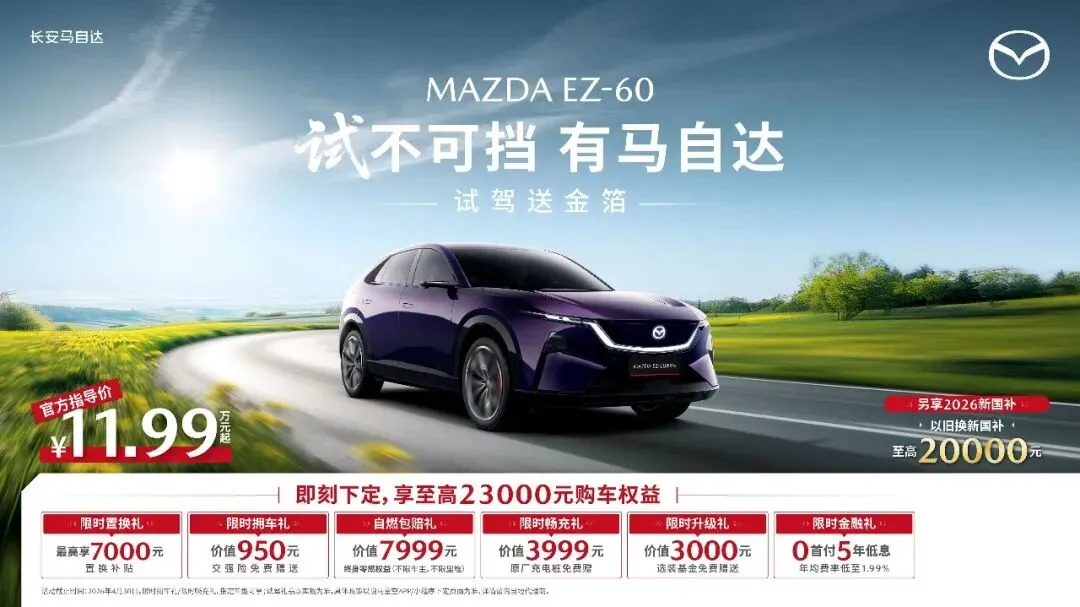 马自达EZ-60是长安马自达中型新能源SUV,纯电/增程双动力,11.99万起,后置后驱。试驾送金箔,置换至高享2.7万补贴(国补+厂补)。