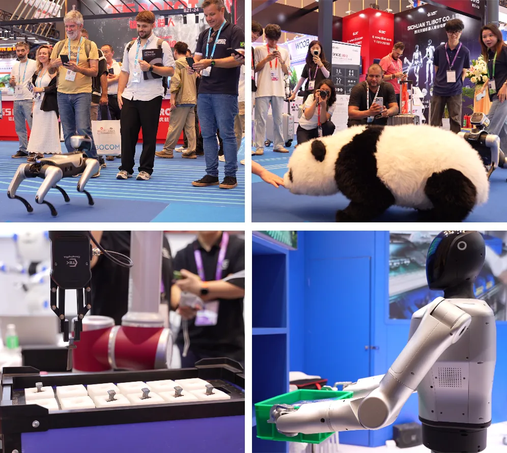 不过我觉得最让人激动的,还是机器人展区。人形机器人、四足机器人各显神通:有的灵活地端盒子、取东西,可以箱入库和物料运转上一站式搞定;有的跟着音乐蹦跳,动作丝滑流畅。展台前围满了观众,大家纷纷伸手互动,感受 “中国智造” 的温度。我必须说,除了春晚,这是我看机器人最多的一天。