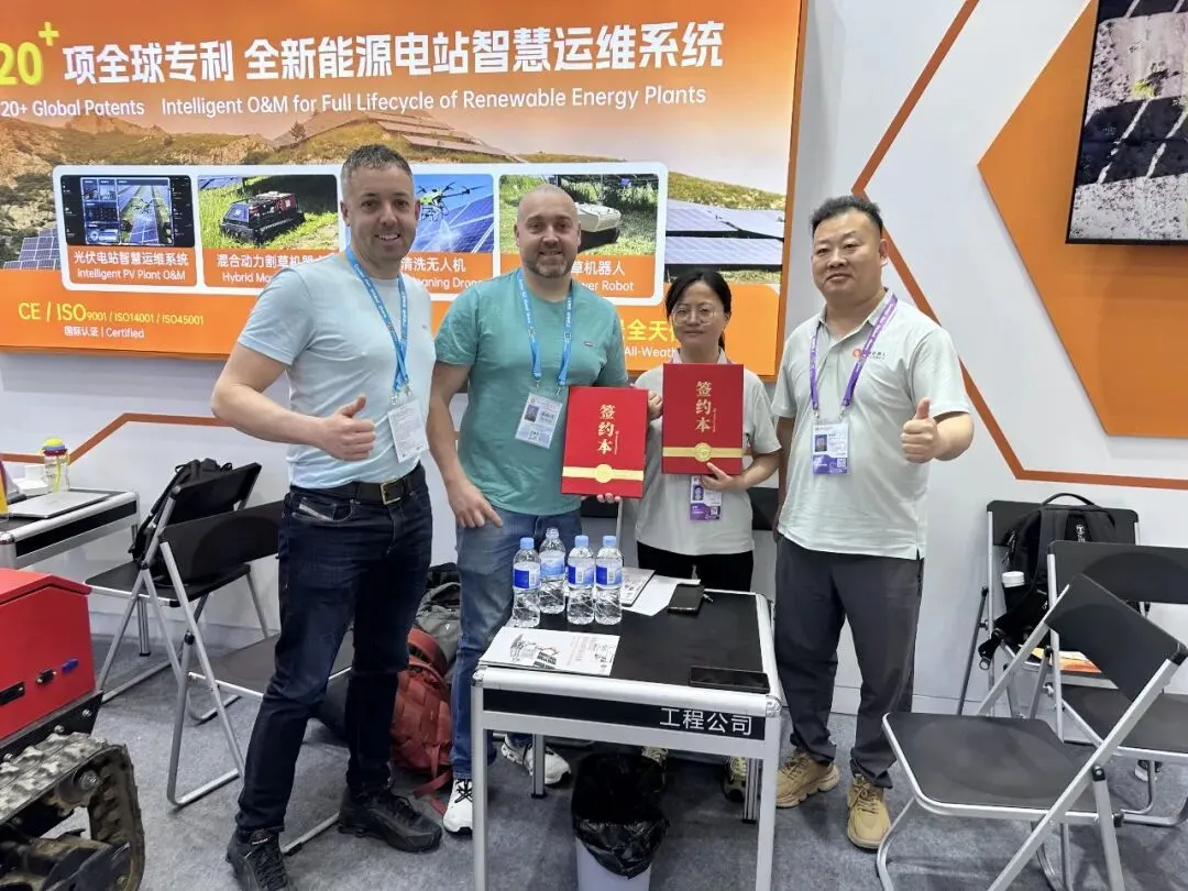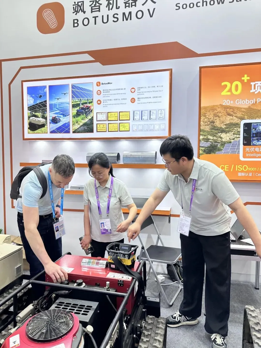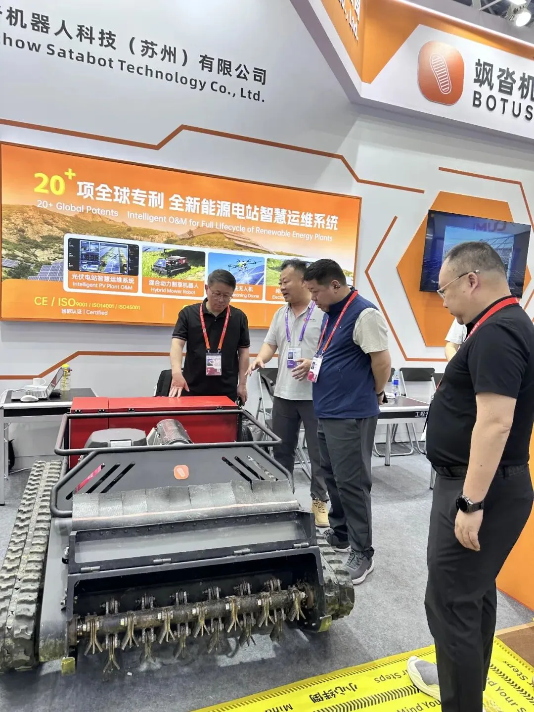 在光伏清洁场景演示中,无人机模拟电站组件清洁流程,吸引不少客户驻足拍摄;而在户外作业区域,割草设备的稳定运行与通过性,也成为客户反复询问的重点。