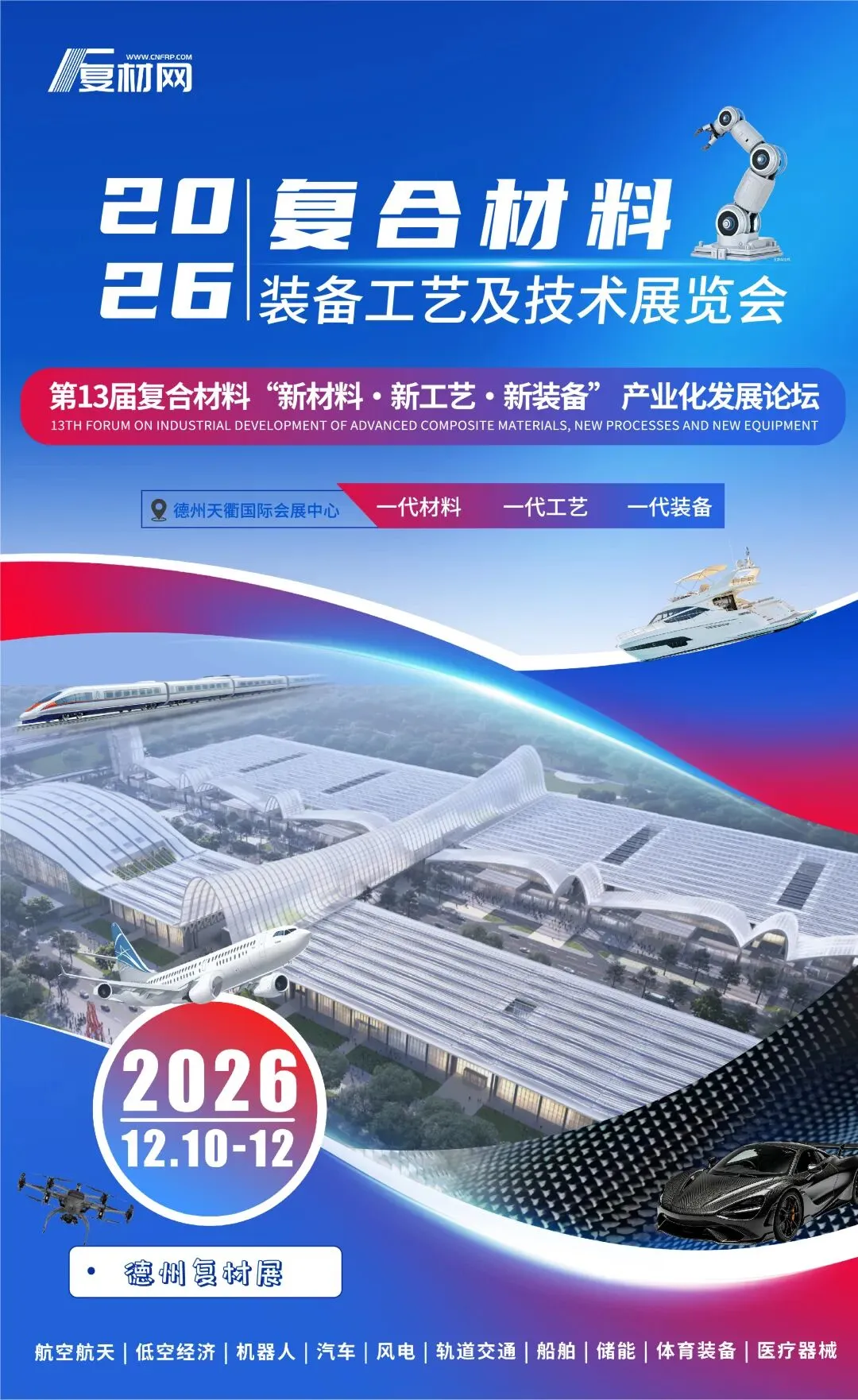 为精准对接“十五五”政策导向,落实产业链强链、补链要求,推动“新材料、新工艺、新装备”与智能智造技术的协同迭代与产业化落地,助力多元复合材料与配套工艺、装备的协同创新发展,实现 “一代材料・一代工艺・一代装备” 的高质量发展目标,复材网在成功举办十二届会议基础上,决定于2026年12月10日-12 日在山东・德州天衢国际会展中心举办第 13 届复合材料“新材料・新工艺・新装备” 产业化发展论坛暨2026复合材料装备工艺及技术展览会。
