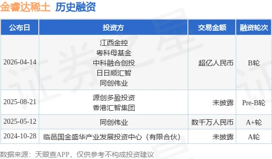 4月16日,天眼查显示,山东金睿达稀土新材料有限公司(下称“金睿达稀土”)完成超亿元B轮战略融资。据了解,本轮由江西金控、粤科母基金、中科融合创投、日日顺汇智联合投资,老股东同创伟业持续追加投资。