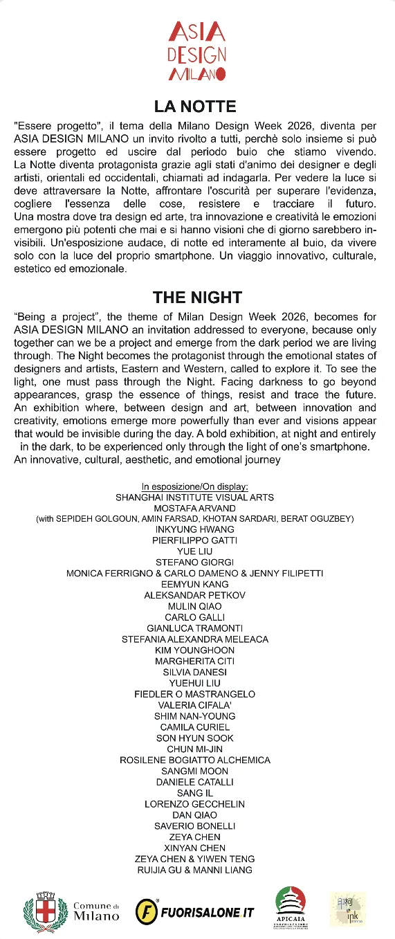 2026 年米兰设计周(Milano Design Week)暨米兰家具展场外展(Fuorisalone)期间,由 ASIA DESIGN MILANO 主办、 APICAIA意大利亚洲文化艺术交流协会 担任主合作伙伴的 THE NIGHT 主题大展,将于 4 月 21 日 至 25 日在米兰 LE CISTERNE - LA FABBRICA DEL VAPORE 正式启幕。