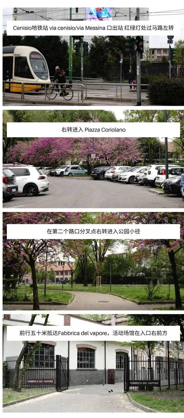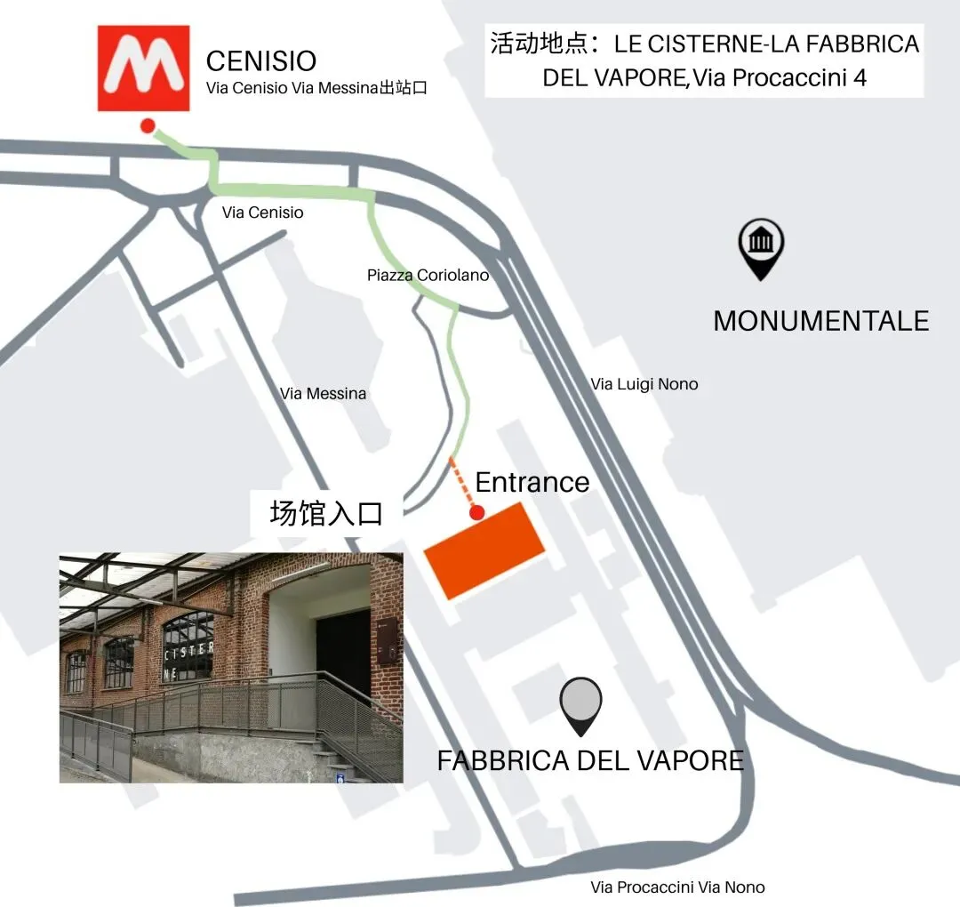 观展者可以乘坐米兰地铁 M5 紫线至 Cenisio 站,从 Via Cenisio/Via Messina 出站口出站,经红绿灯路口过马路左转,右转进入 Piazza Coriolano 广场,在第二个路口分叉点右转进入公园小径,直行 50 米即可抵达 LA FABBRICA DEL VAPORE 园区