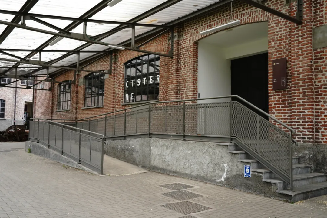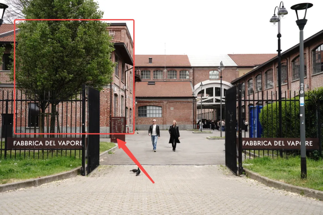 活动场馆 LE CISTERNE 位于园区入口右前方,为路口左侧树木后方的红砖厂房,场馆入口玻璃上有醒目的字母 “ CISTERNE ” 标识,可快速定位。