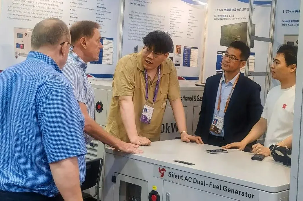 展品兼具环保、高效、适配性强等优势,其中静音发电机组采用静音箱体与静音棉包覆设计,搭配两用燃料发动机,兼顾经济性与便捷性;增程式甲醇机组则颠覆传统发电模式,碳排放大幅降低,全生命周期成本优势显著,可适配高原、高寒等极端环境。