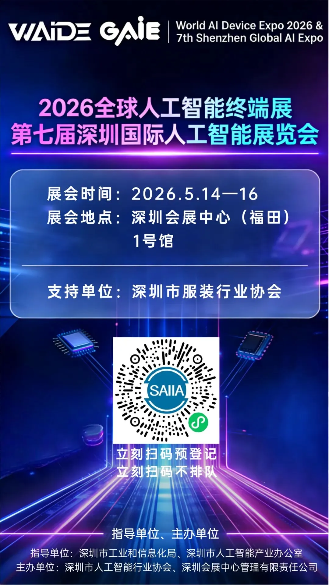 由深圳市工业和信息化局、深圳市人工智能产业办公室指导,深圳市人工智能行业协会、深圳会展中心管理有限责任公司共同主办,深圳市服装行业协会支持的“2026全球人工智能终端展暨第七届深圳国际人工智能展览会”将于2026年5月14日—16日在深圳会展中心(福田)1号馆举办。展会聚焦人工智能终端产品技术落地与产业协同,全方位解码AI终端产业从技术突破到场景落地的完整生态图谱。